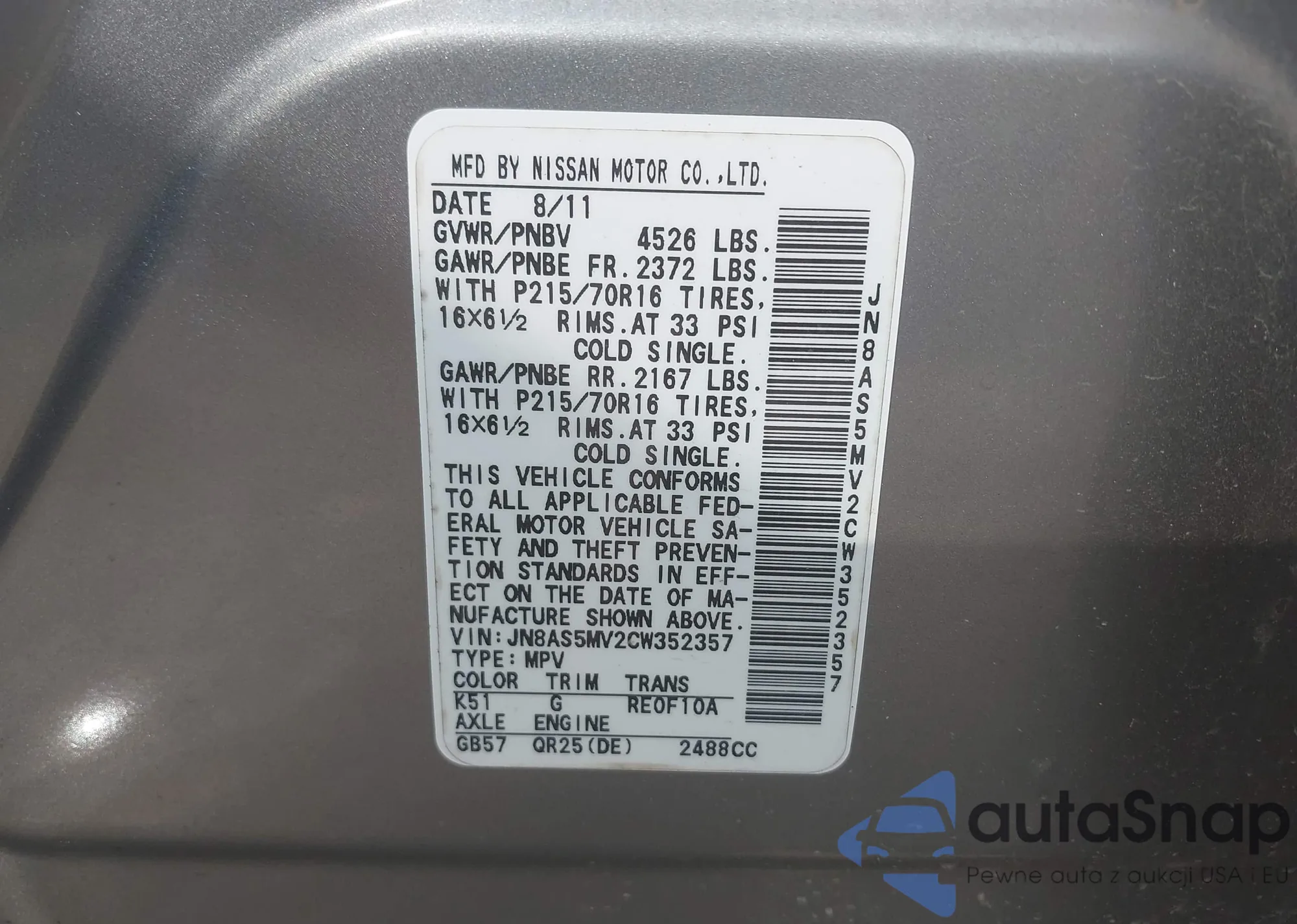 LOT: 42901225 VIN: JN8BT3BA5PW412420