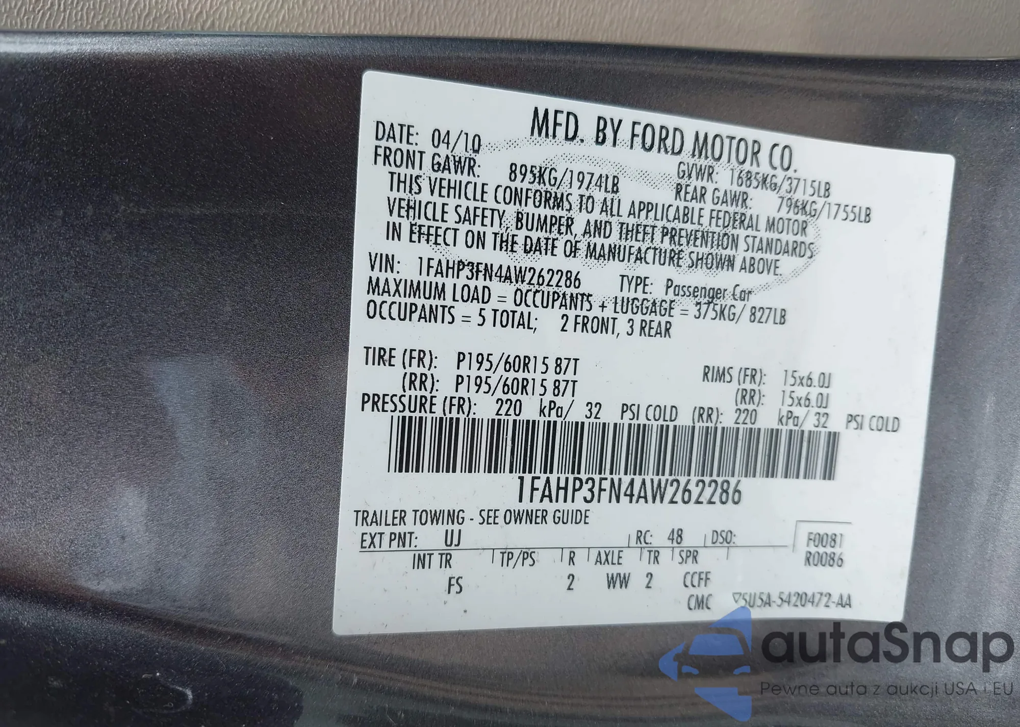 LOT: 42914603 VIN: 1FAHP3FN4AW262286