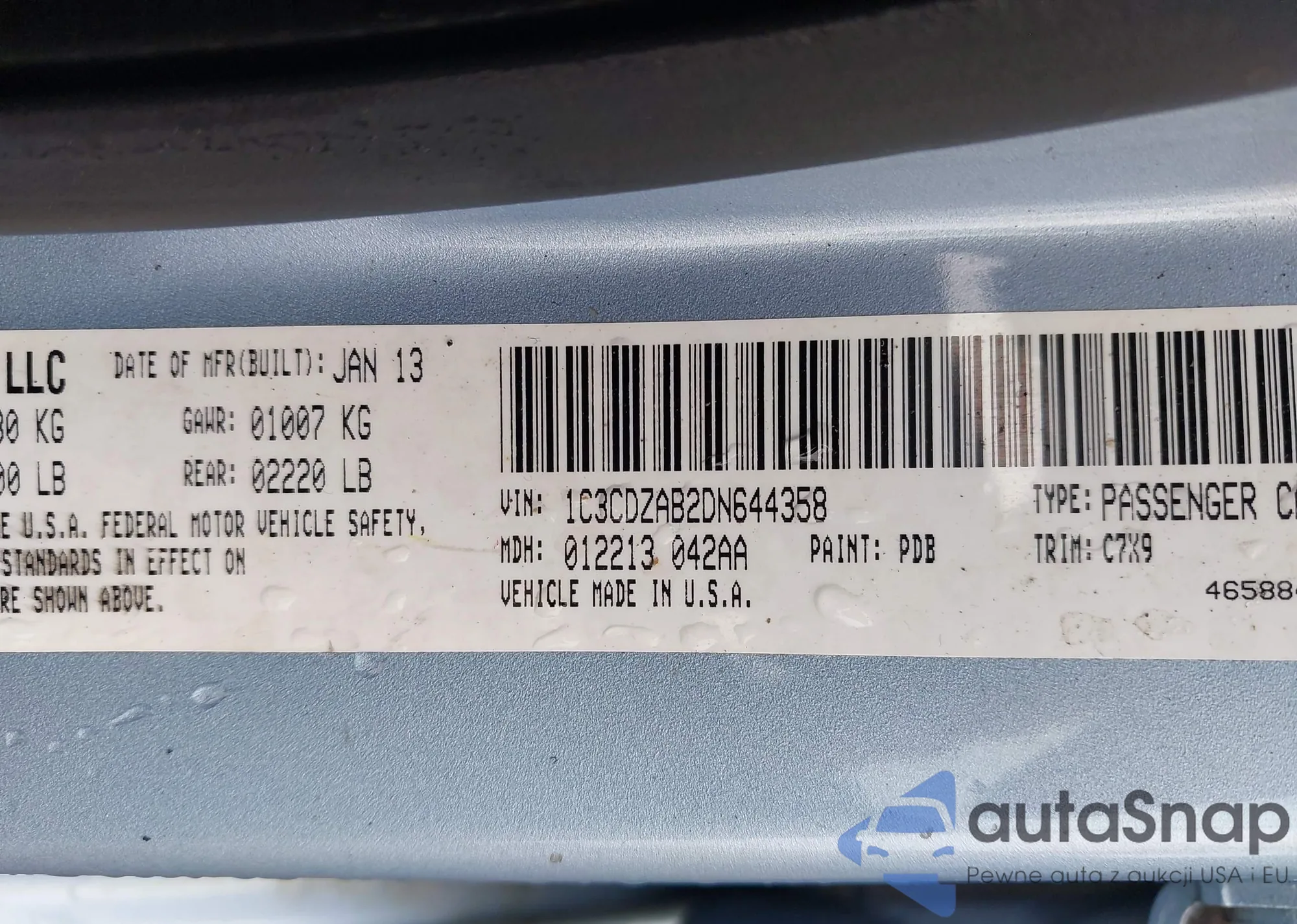 LOT: 42891018 VIN: 1C3CDZAB2DN644358