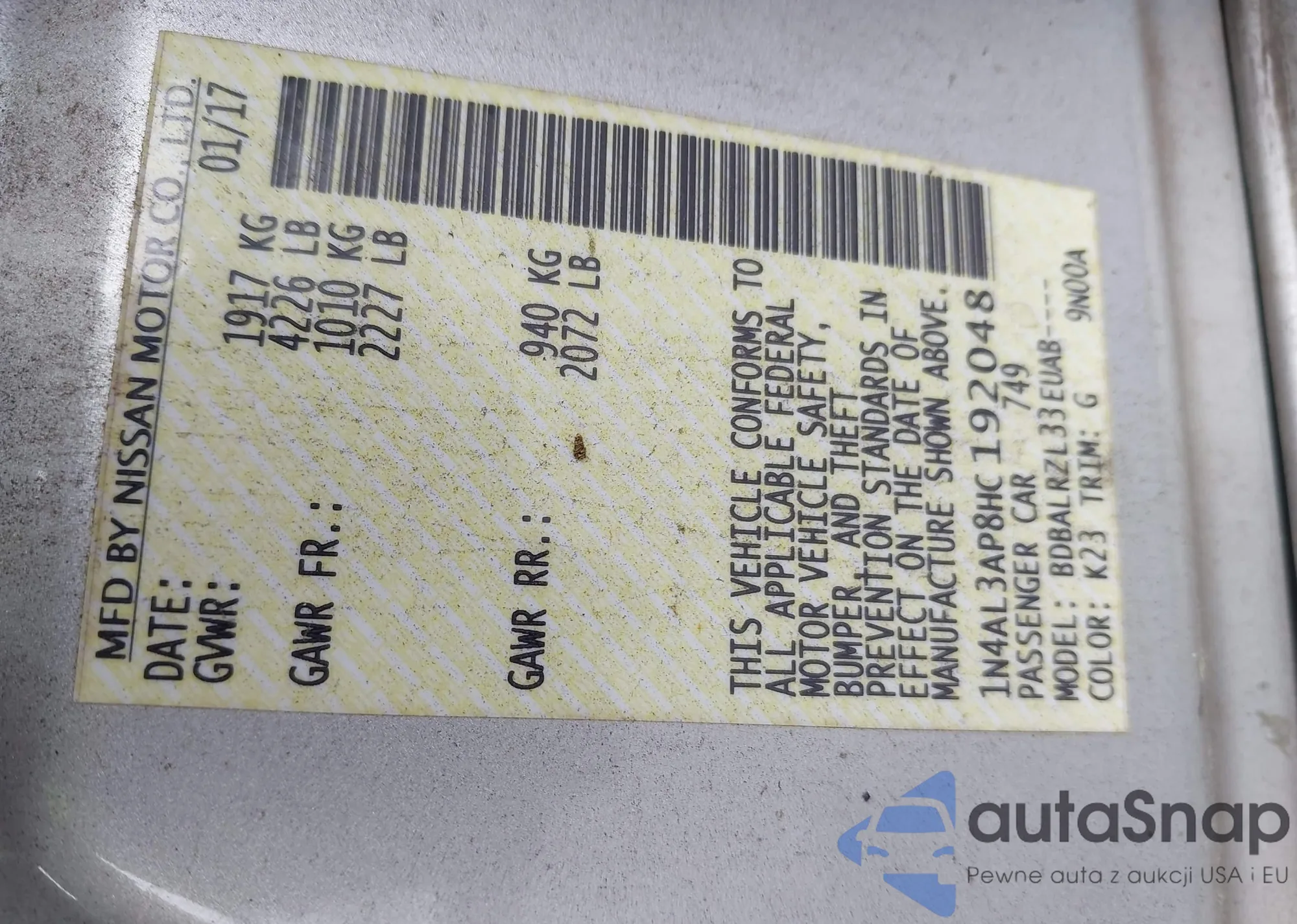 LOT: 42928099 VIN: 1N4AL3AP8HC192048