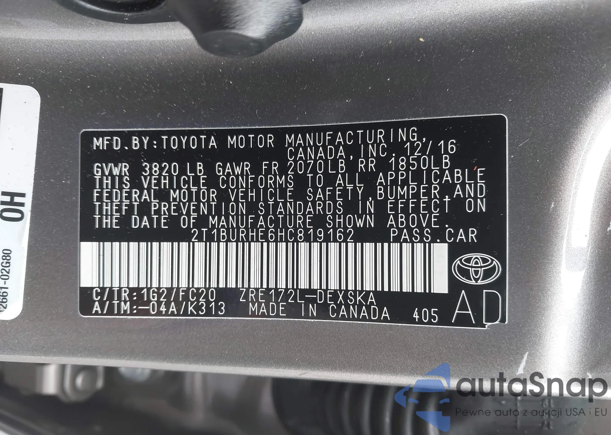 LOT: 43024692 VIN: 2T1BURHE6HC819162