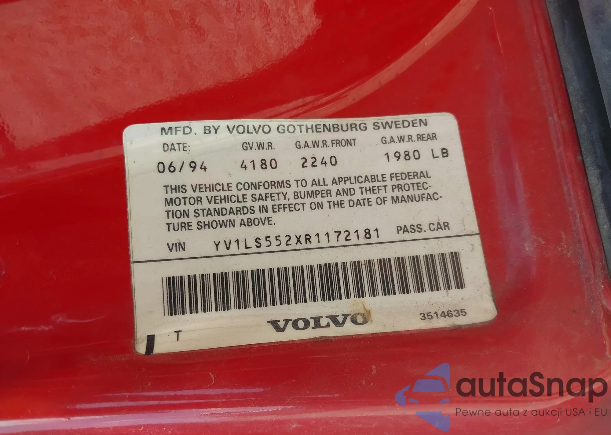 LOT: 42930662 VIN: YV1LS552XR1172181
