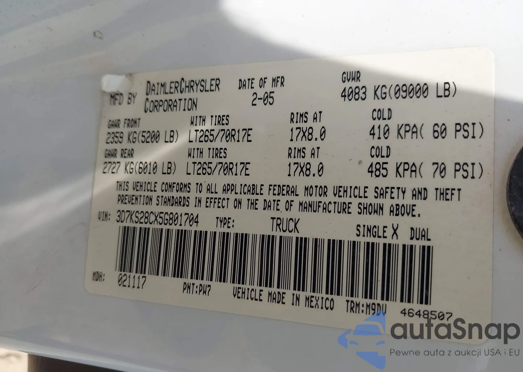 • VIN 3D7KS28CX5G801704