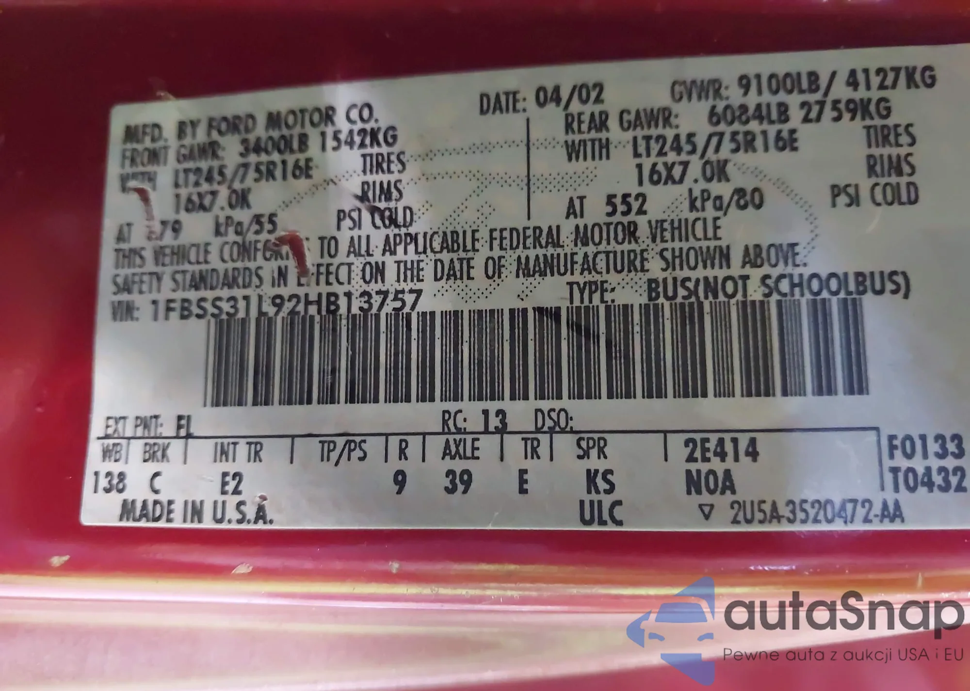 • VIN 1FBSS31L92HB13757