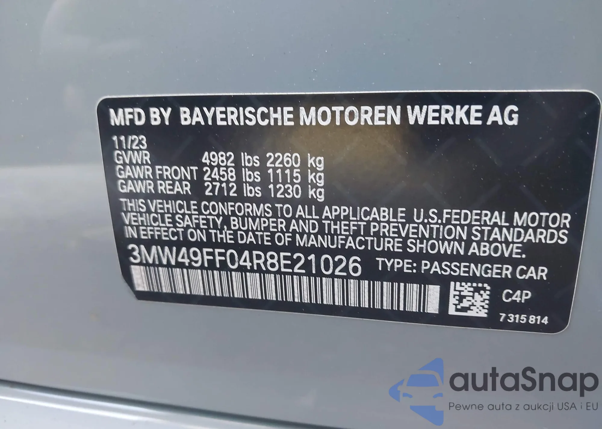 LOT: 42825865 VIN: 3MW49FF04R8E21026