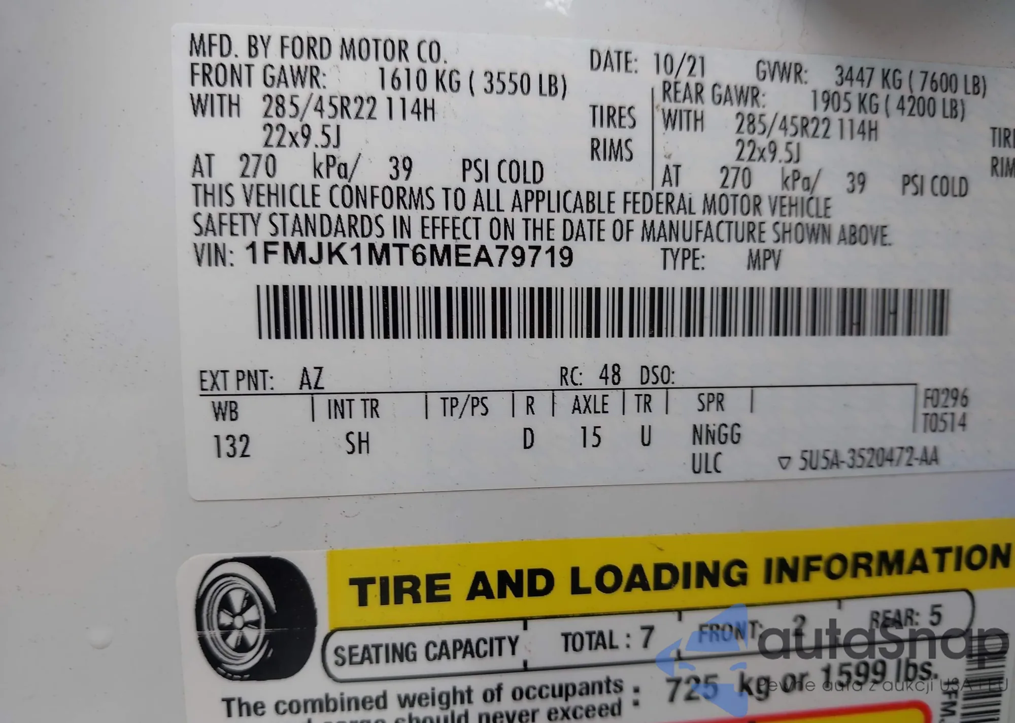 LOT: 43101519 VIN: 1FMJK1MT6MEA79719