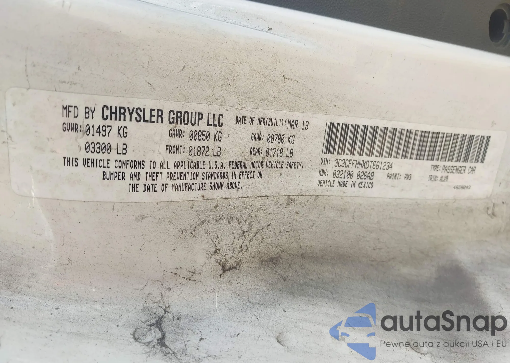 LOT: 42833401 VIN: 3C3CFFHHXDT661234