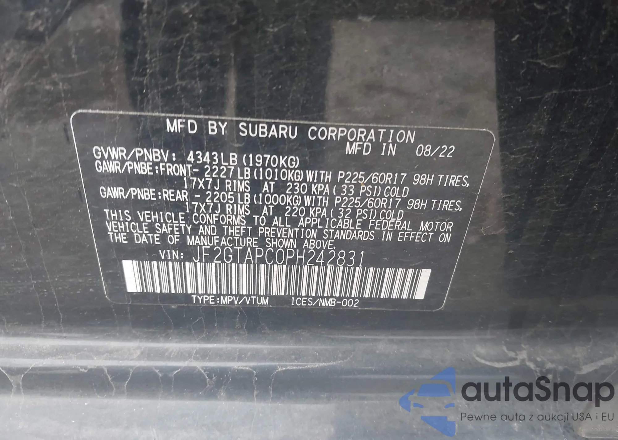 LOT: 43022690 VIN: JF2GTAPC0PH242831