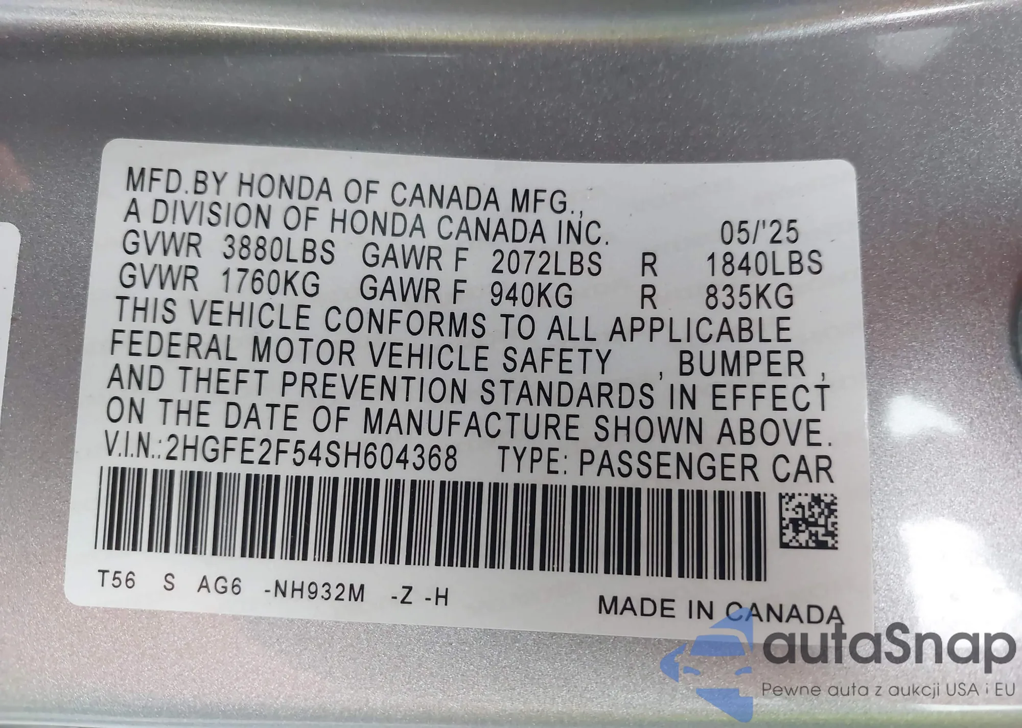 LOT: 43108350 VIN: 2HGFE2F54SH604368