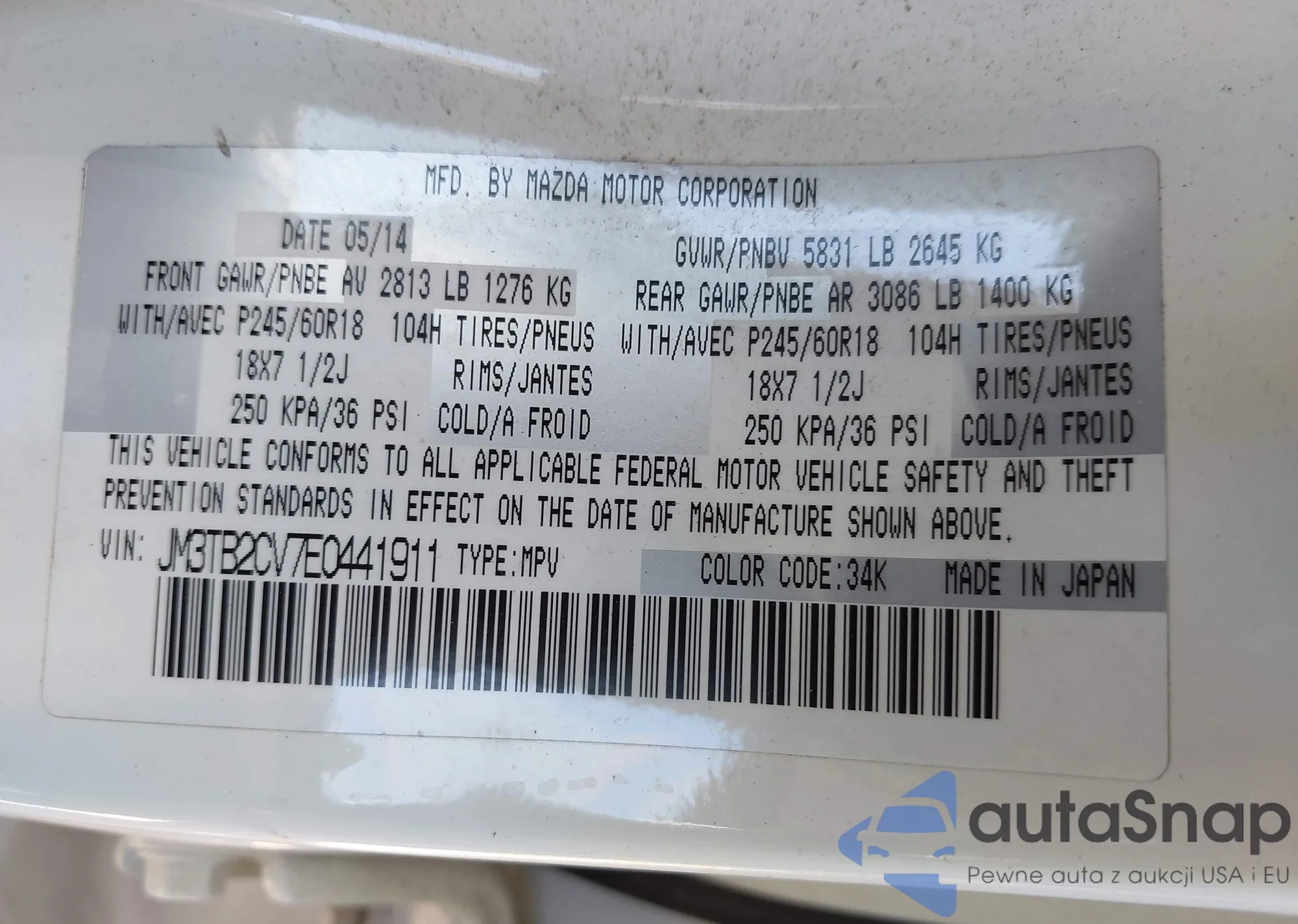 • VIN JM3TB2CV7E0441911