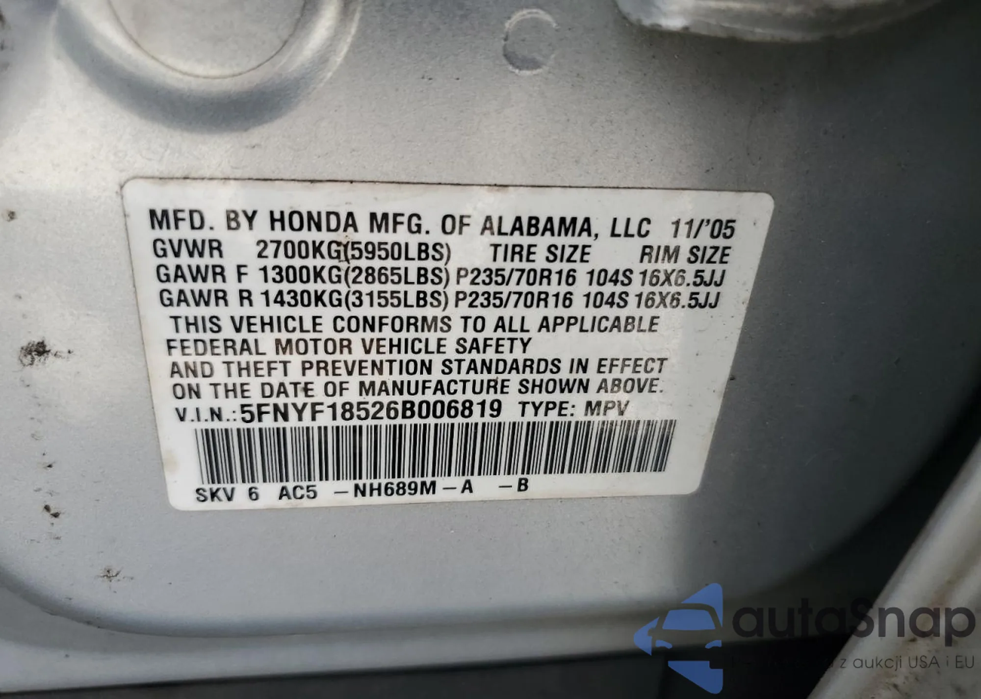• VIN 5FNYF18526B006819