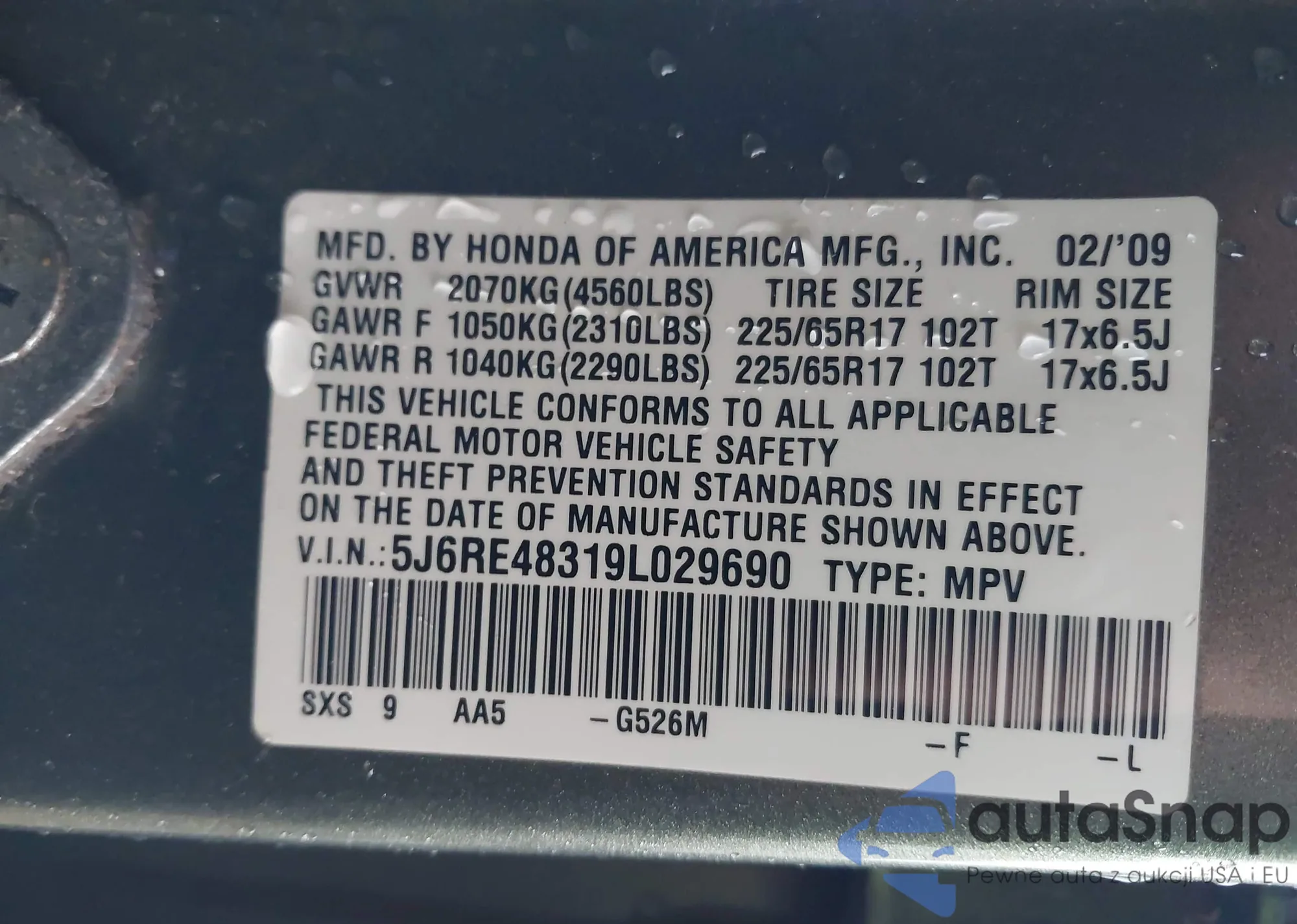 • VIN 5J6RE48319L029690