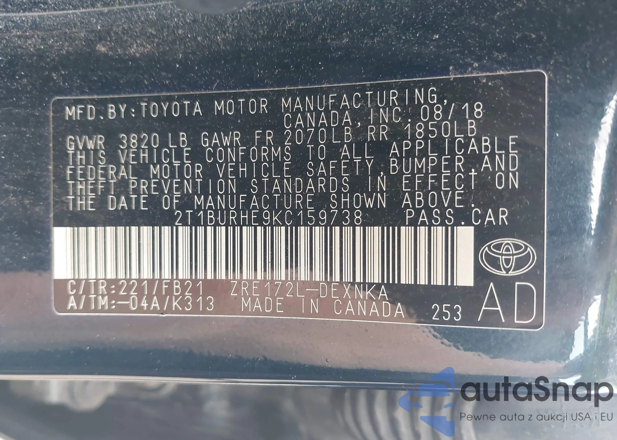 LOT: 42540207 VIN: 2T1BURHE9KC159738