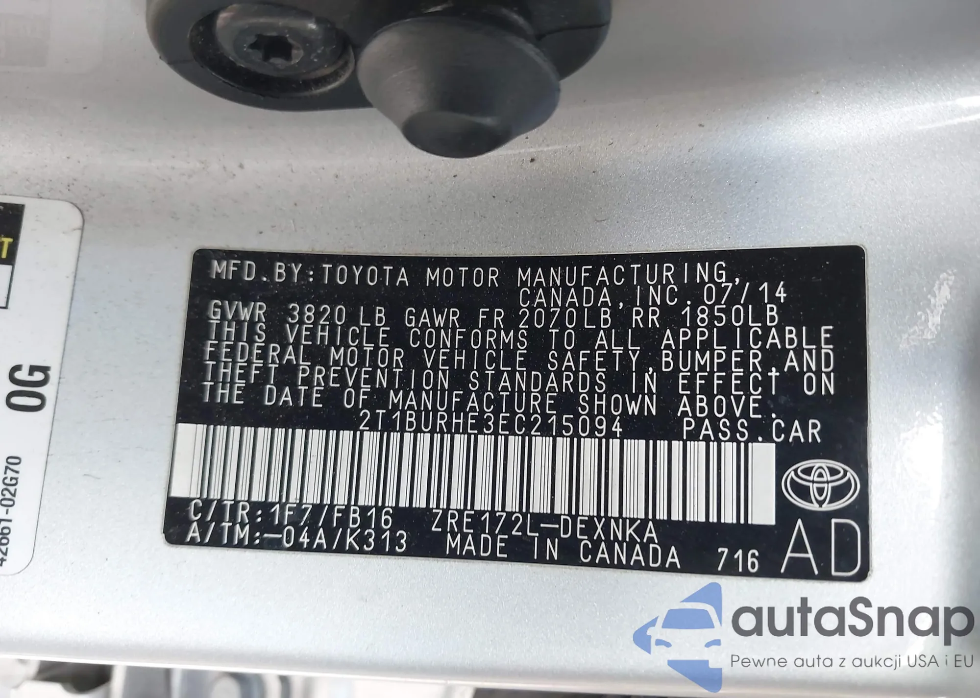 LOT: 42985051 VIN: 2T1BURHE3EC215094