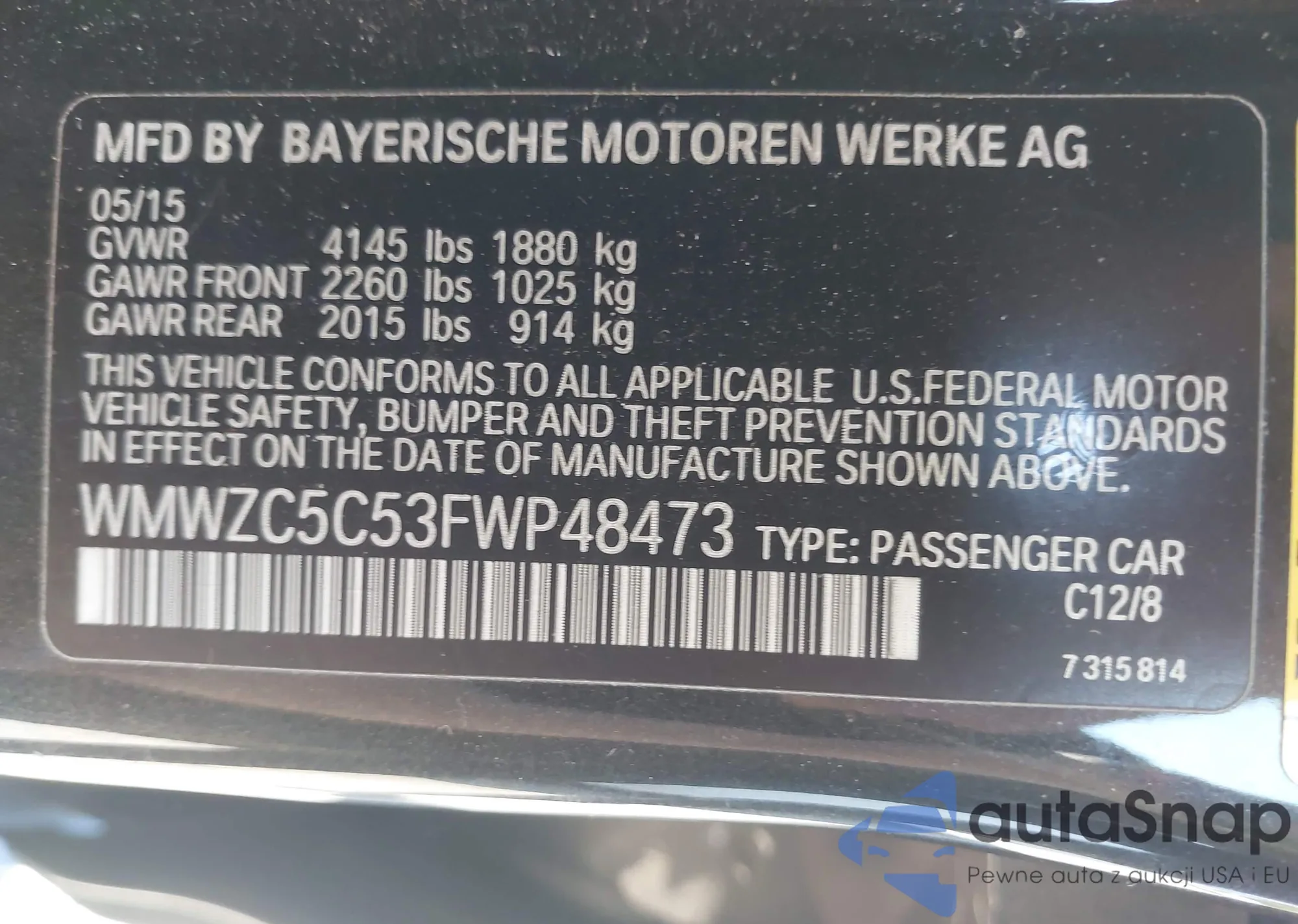 LOT: 43110995 VIN: WMWZC5C53FWP48473
