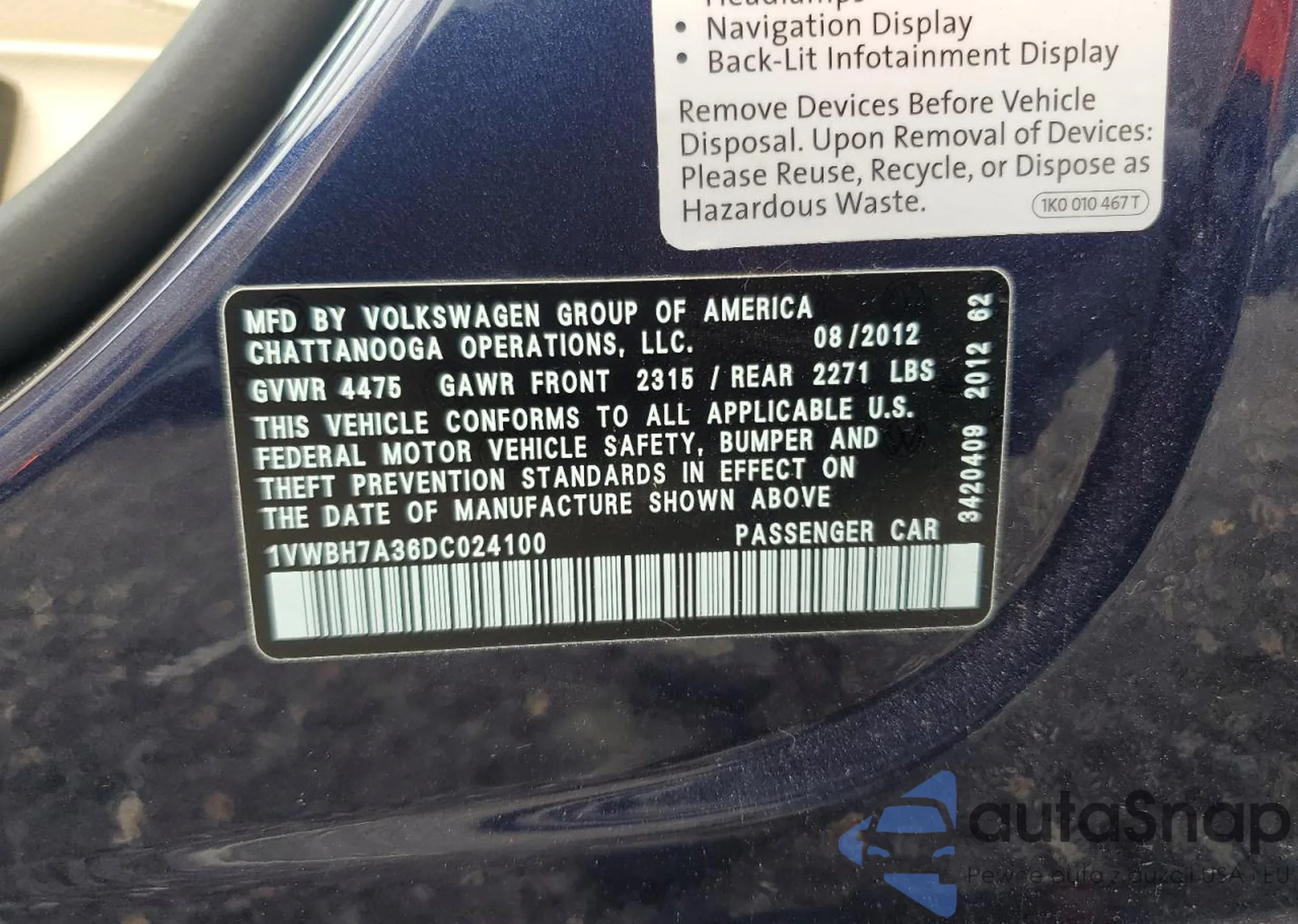 • VIN 1VWBH7A36DC024100