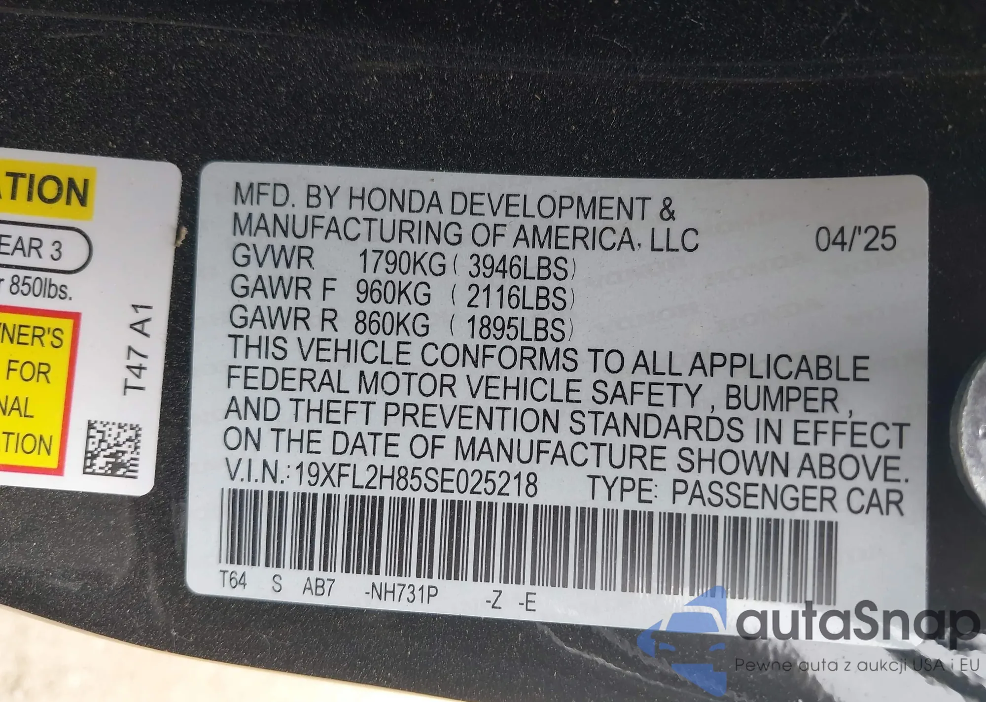 • VIN 19XFL2H85SE025218