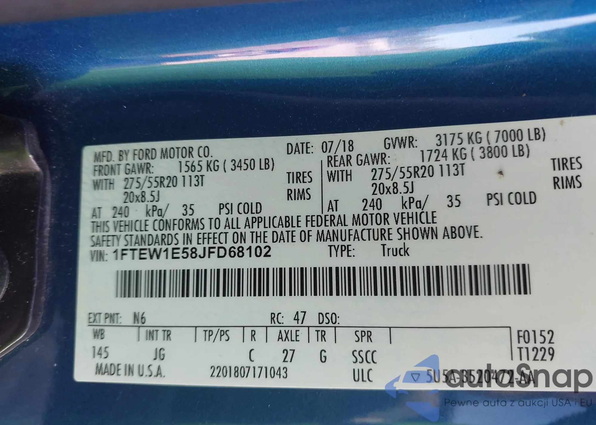 LOT: 43057703 VIN: 1FTEW1E58JFD68102