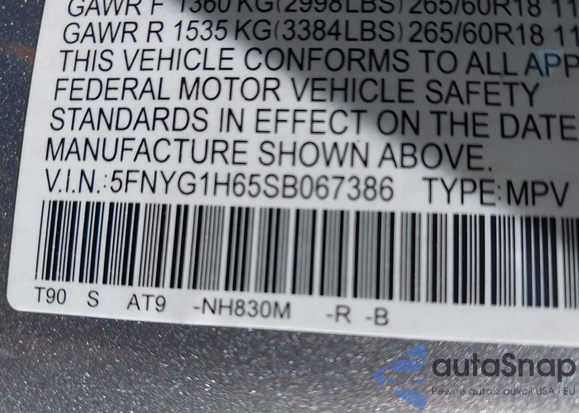 • VIN 5FNYG1H65SB067386