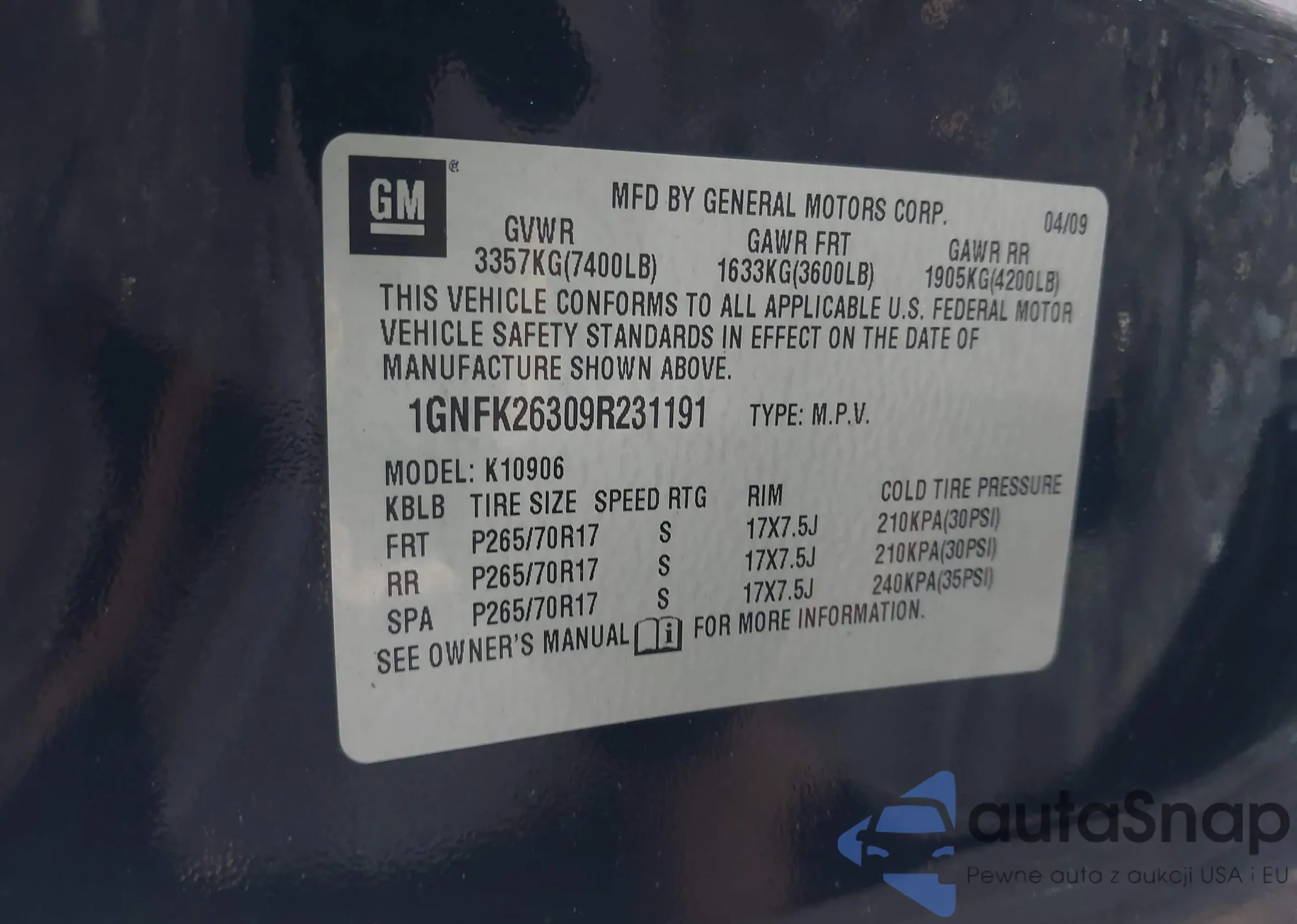 • VIN 1GNFK26309R231191