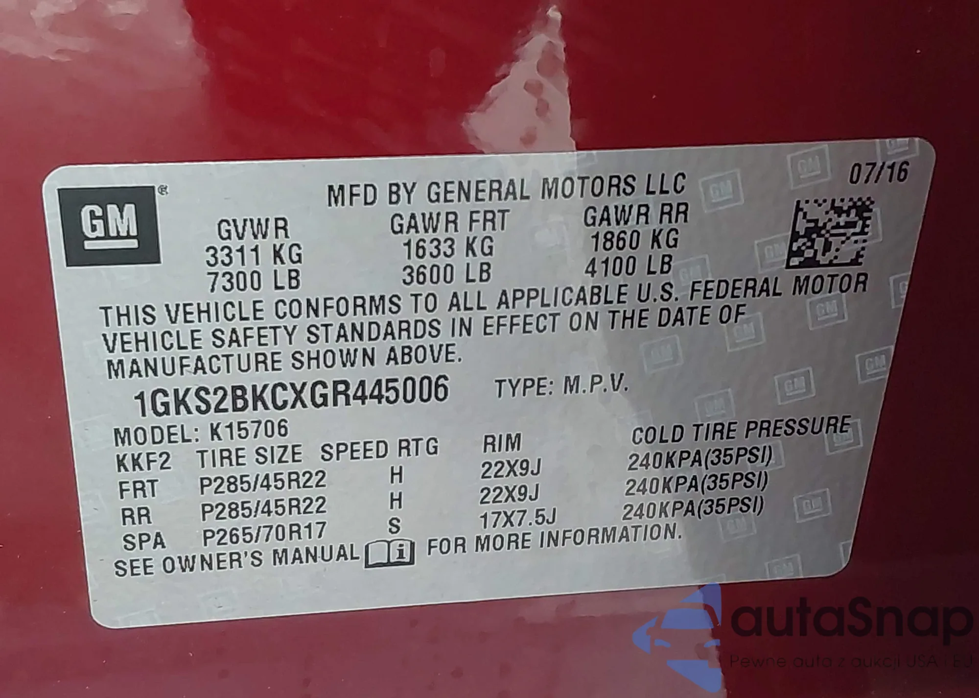 • VIN 1GKS2BKCXGR445006