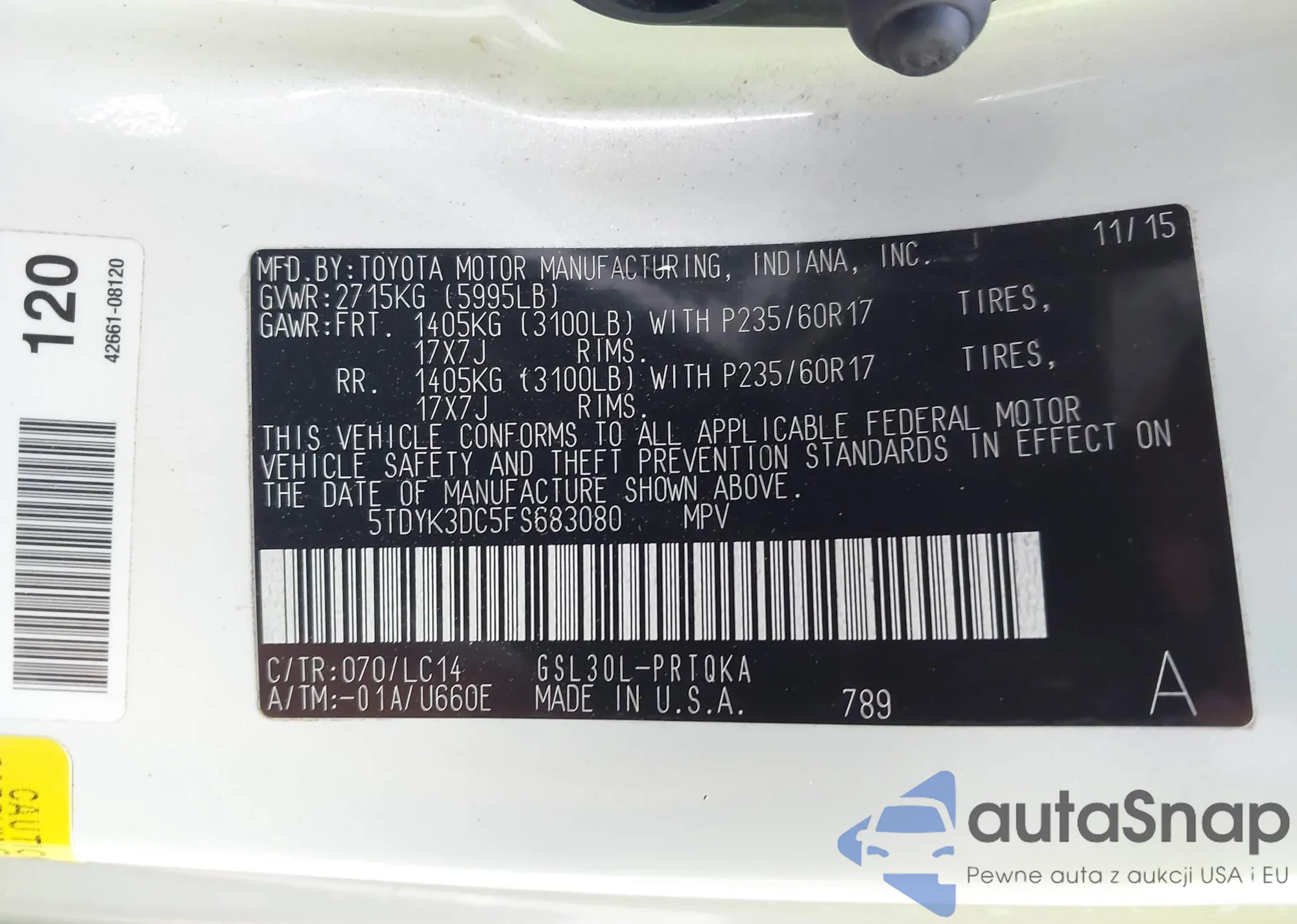 LOT: 42875545 VIN: 5TDYK3DC5FS683080