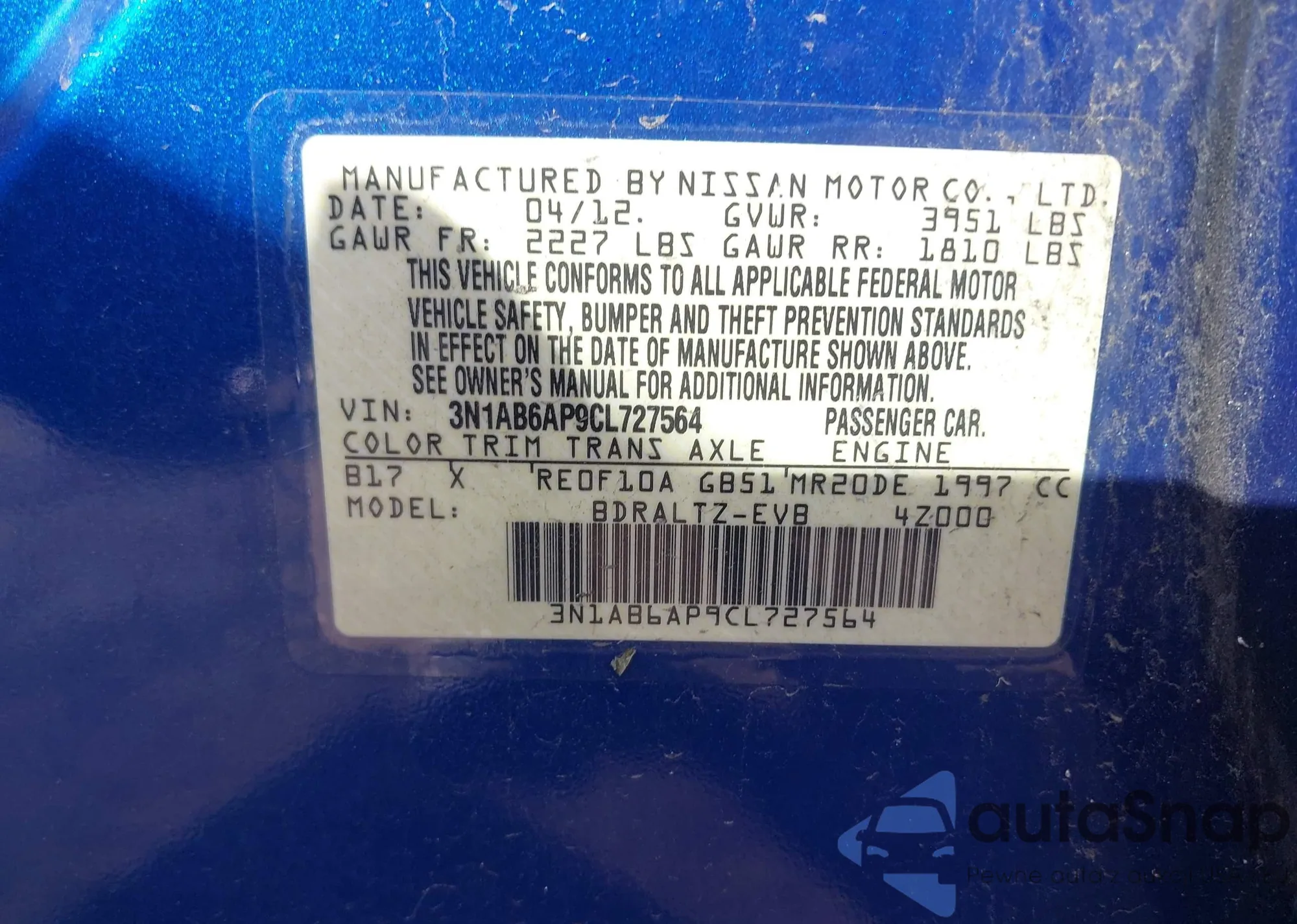 • VIN 3N1AB6AP9CL727564