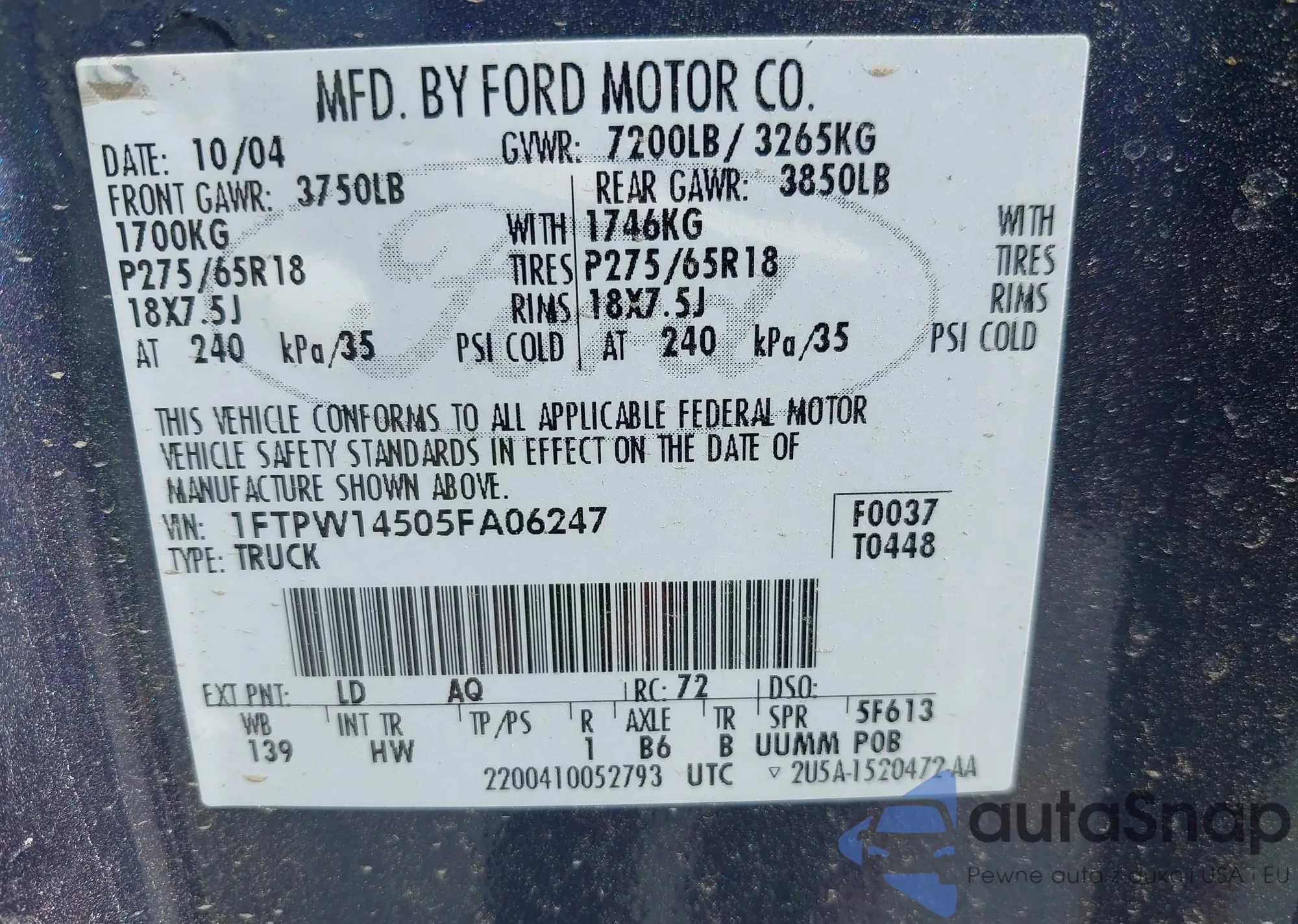 LOT: 43078081 VIN: 1HGCP3F87BA025273