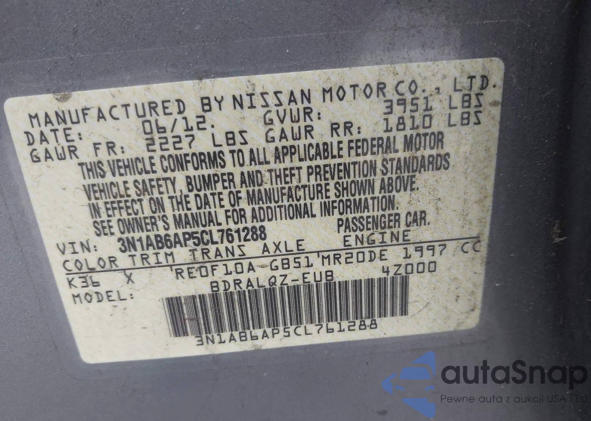 LOT: 43086557 VIN: 3N1AB6AP5CL761288