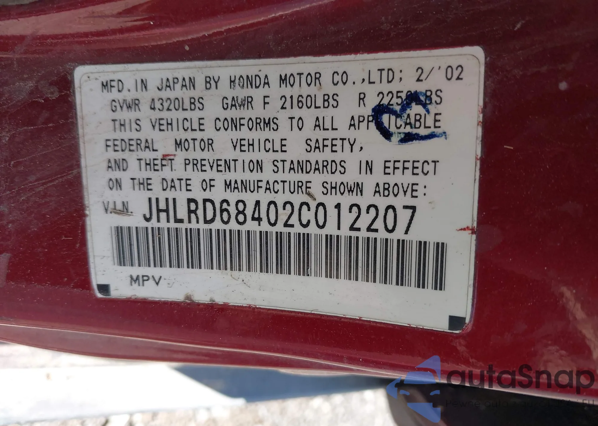 • VIN JHLRD68402C012207