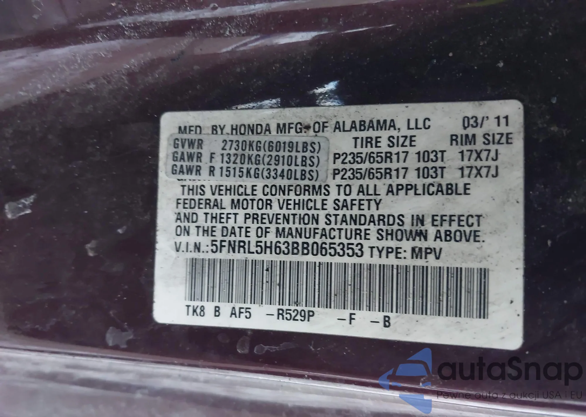 2011 Honda Odyssey Ex-L из США, поврежденный, VIN 5FNRL5H63BB065353