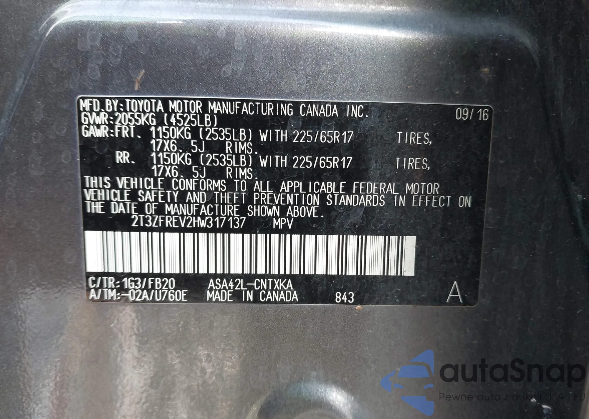 LOT: 43066895 VIN: 2T3ZFREV2HW317137