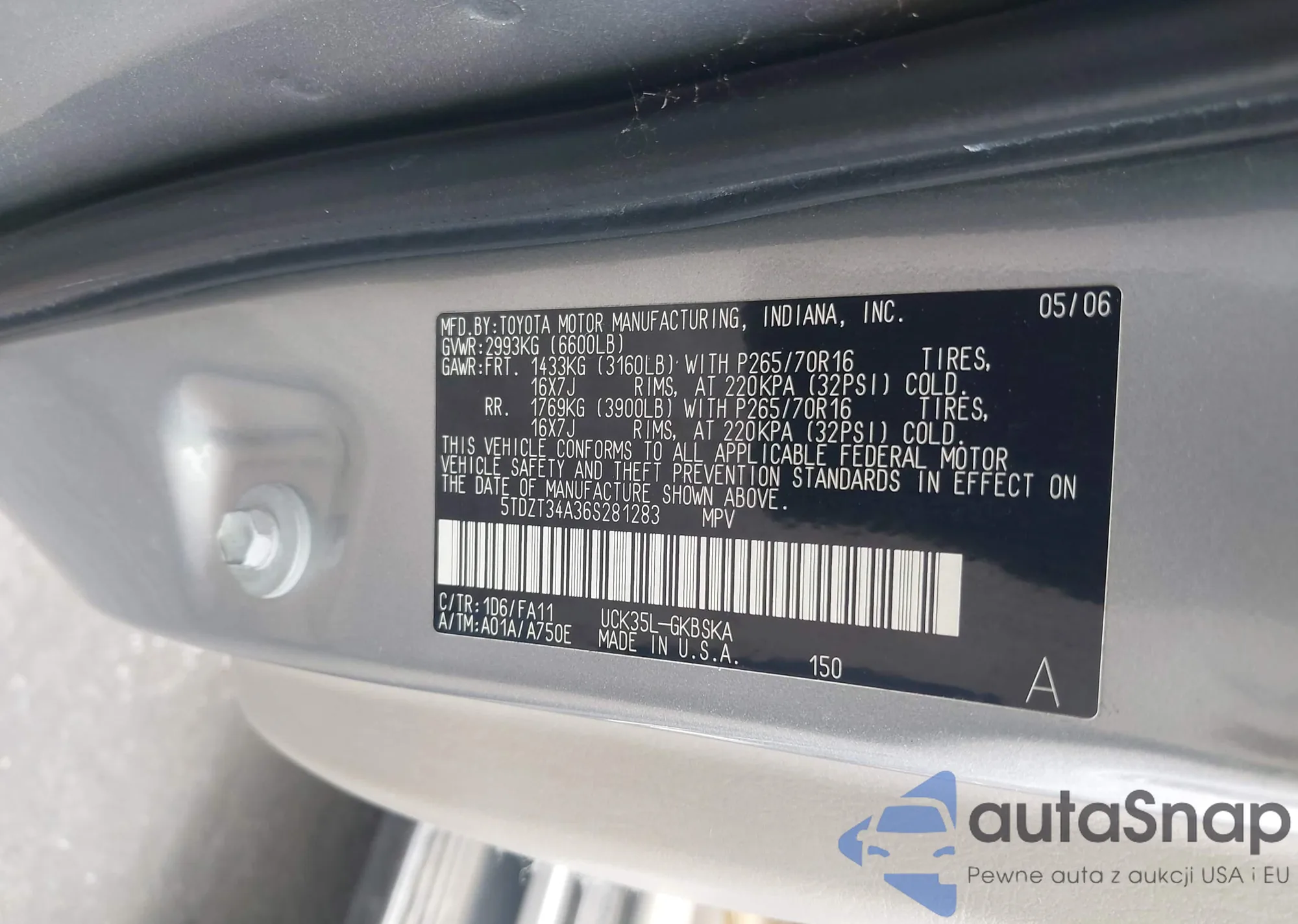 LOT: 43072077 VIN: 5TDZT34A36S281283