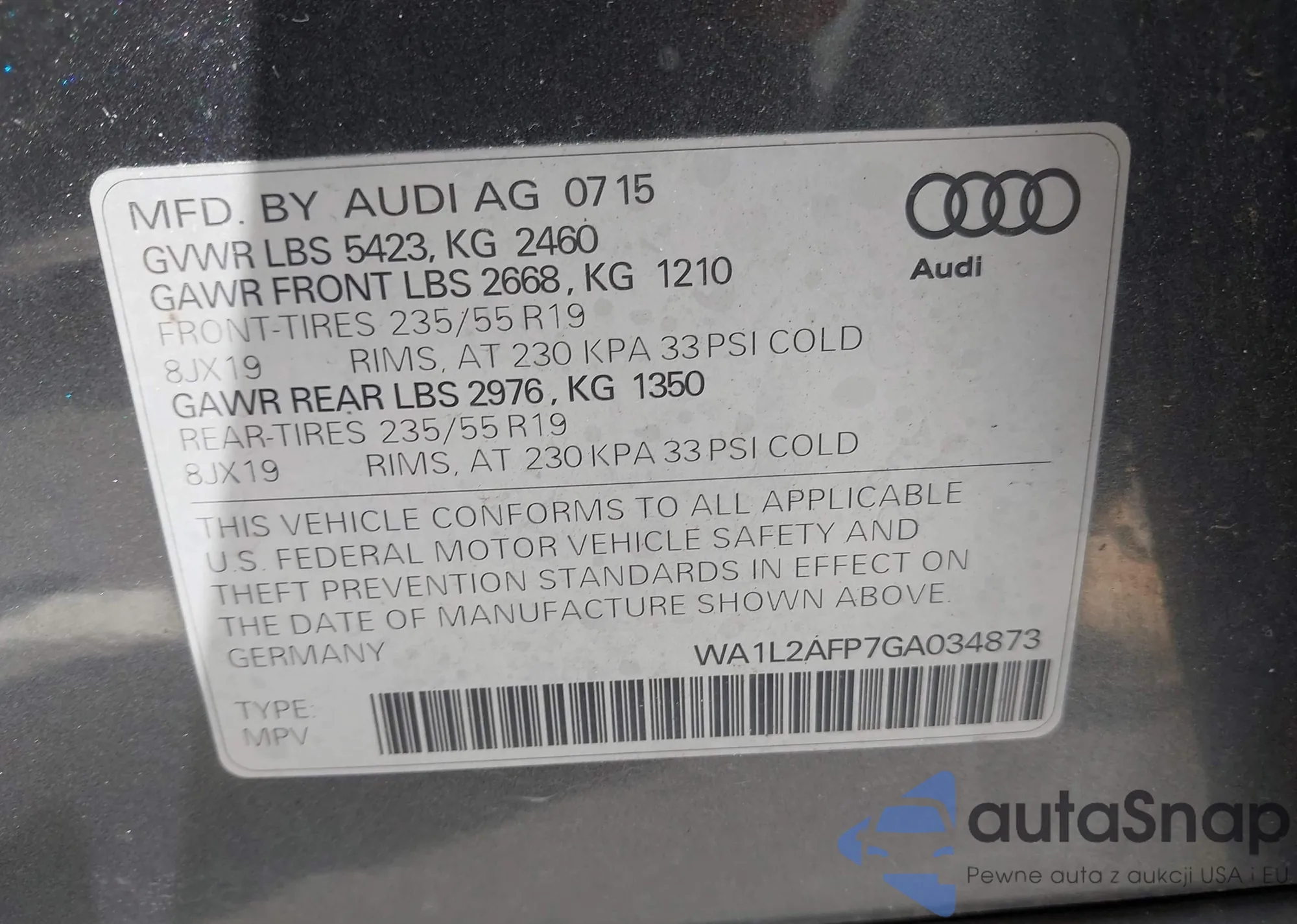 LOT: 43036385 VIN: WA1L2AFP7GA034873