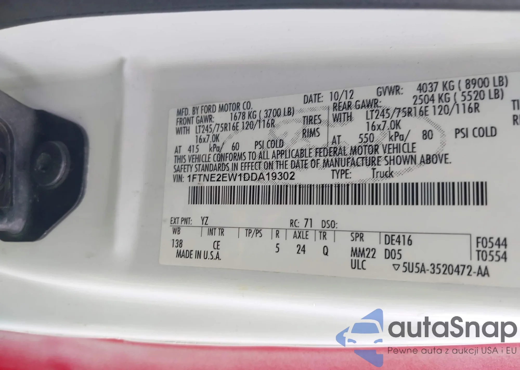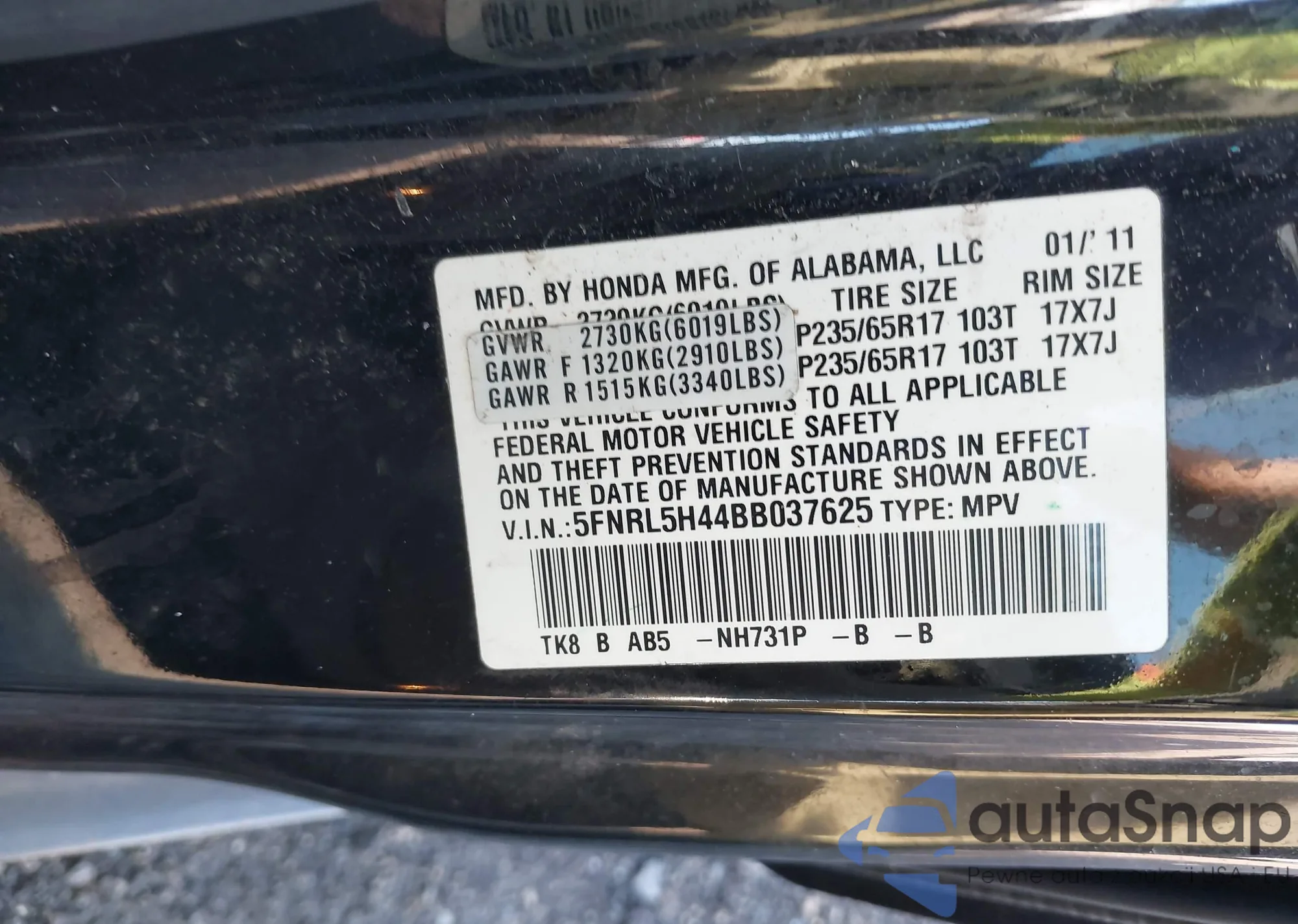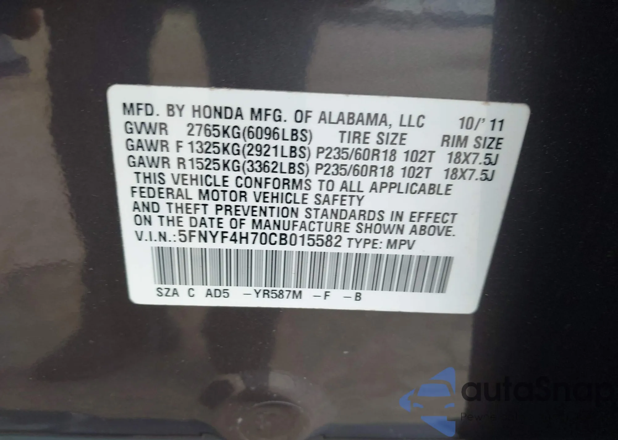 LOT: 43055222 VIN: 5FNYF4H70CB015582