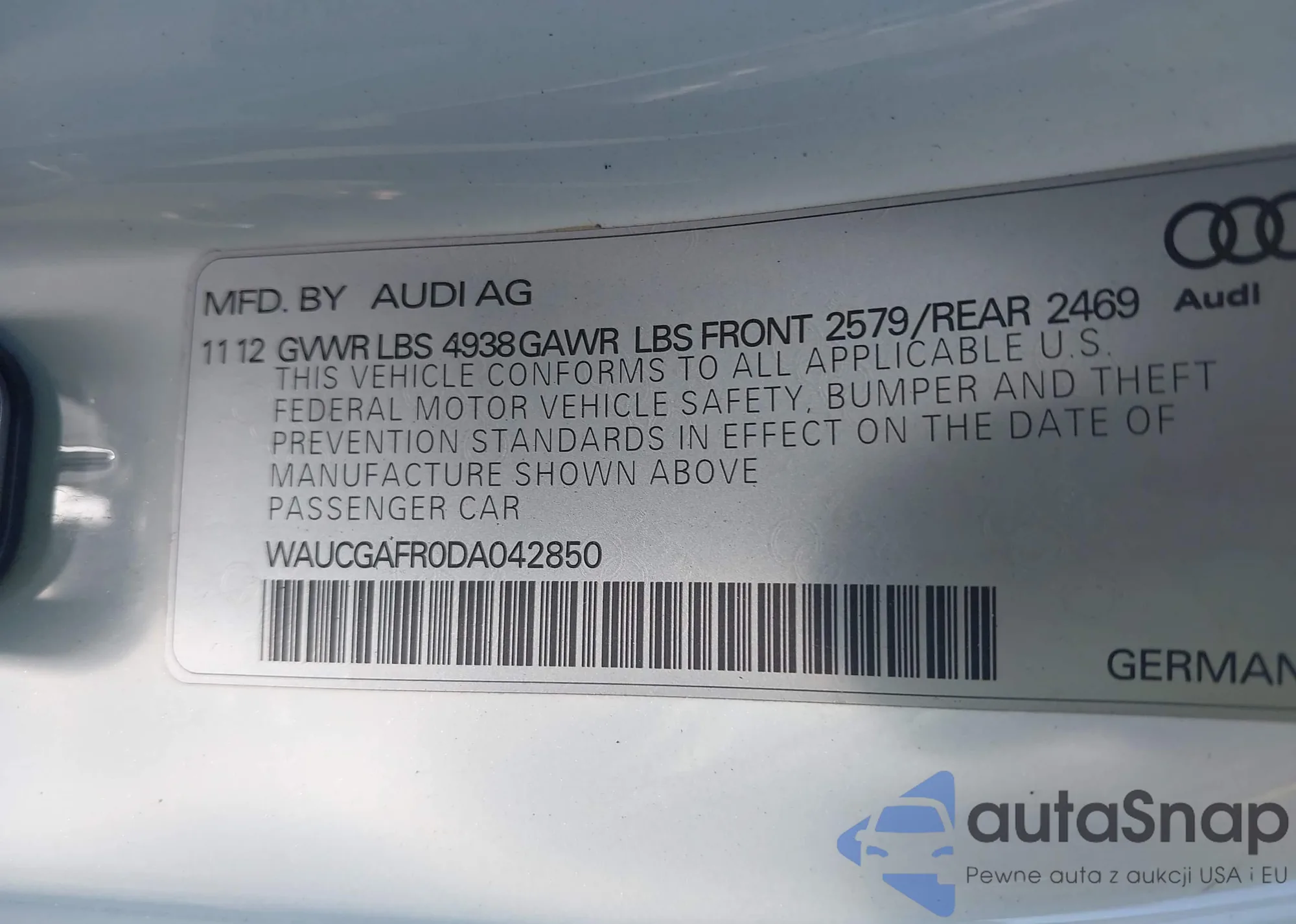 LOT: 42758296 VIN: WAUCGAFR0DA042850