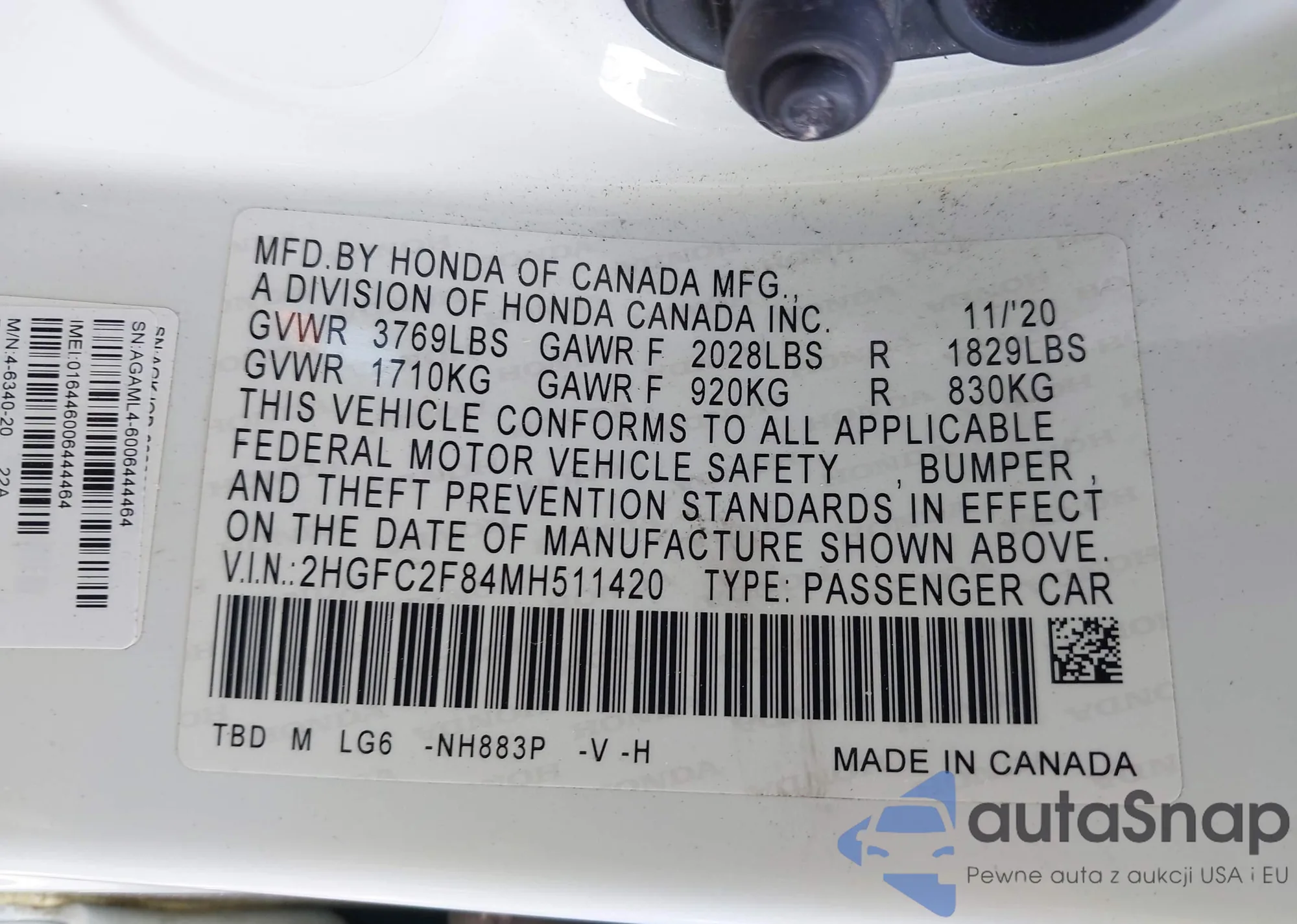 LOT: 42823615 VIN: 2HGFC2F84MH511420
