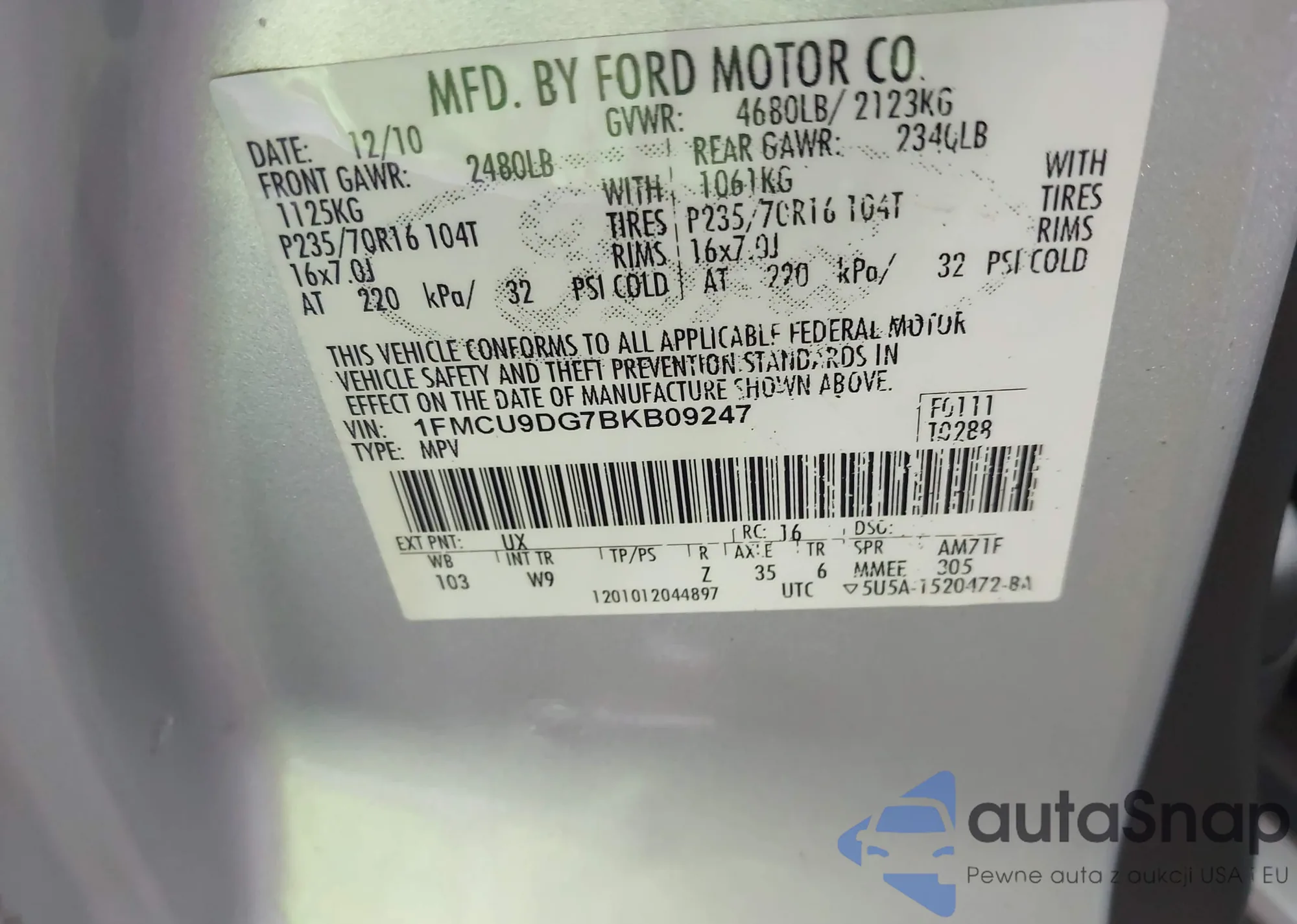 LOT: 43068195 VIN: 1FMCU9DG7BKB09247