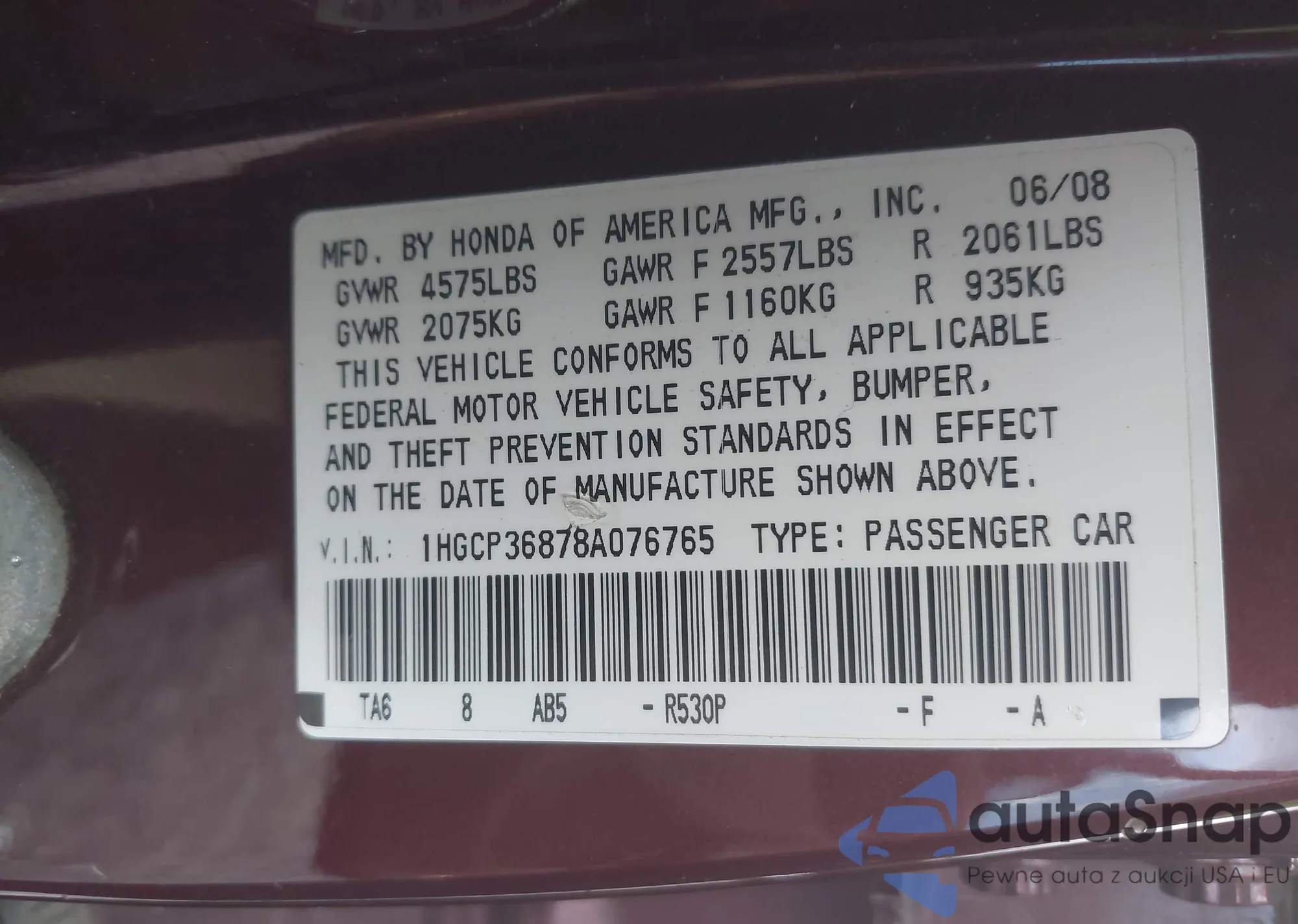 LOT: 43080413 VIN: 1HGCP36878A076765