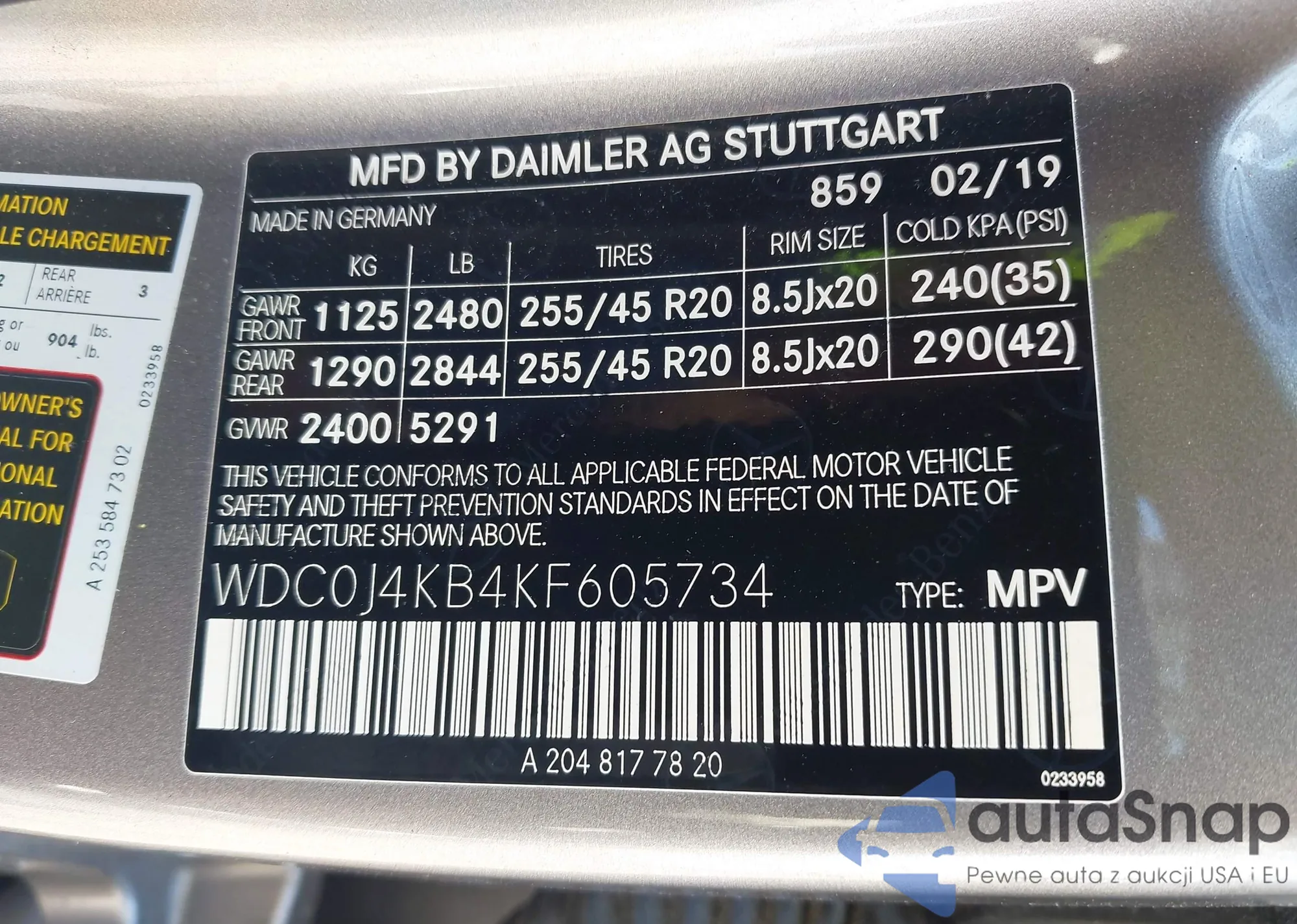 • VIN WDC0J4KB4KF605734