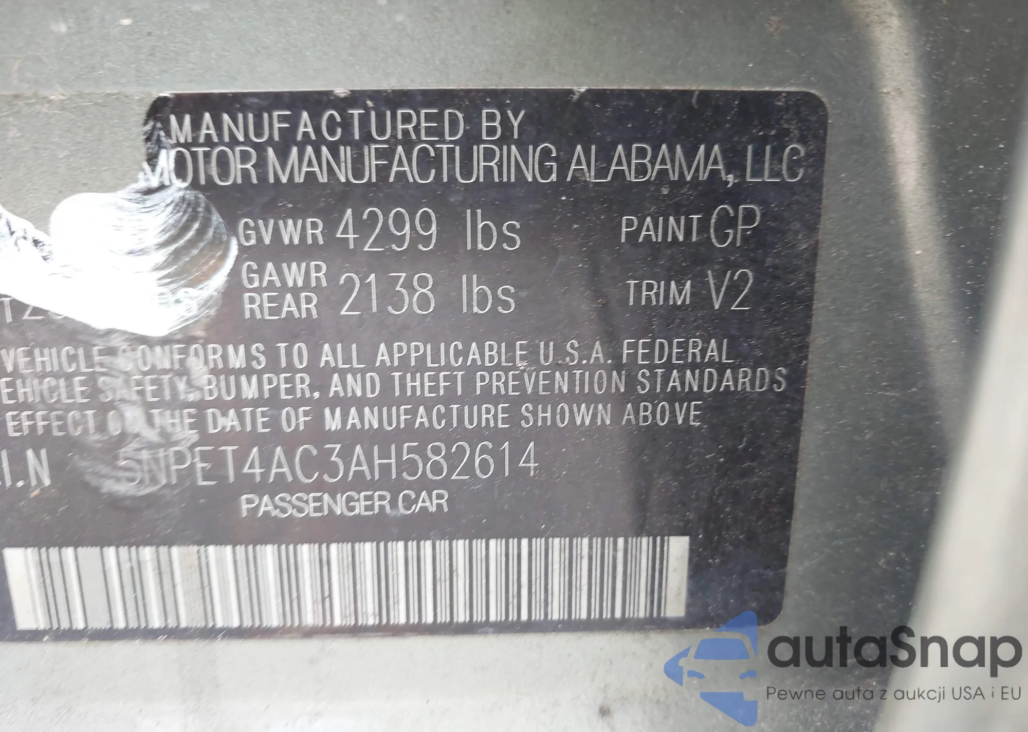 LOT: 42782756 VIN: 5NPET4AC3AH582614