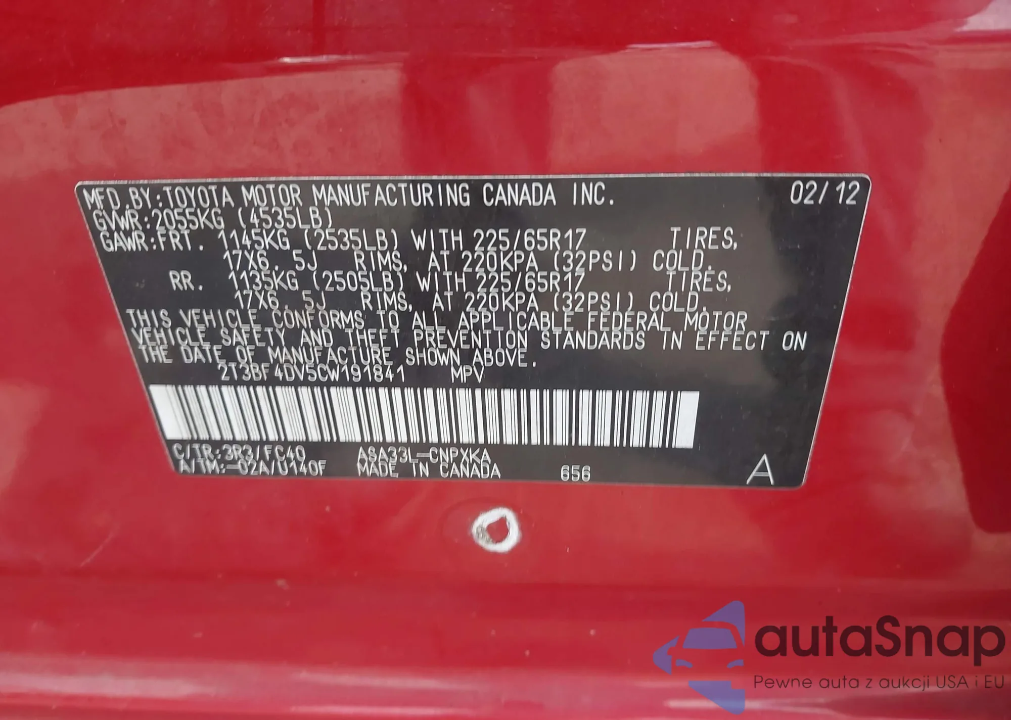 LOT: 42871891 VIN: 2T3BF4DV5CW191841