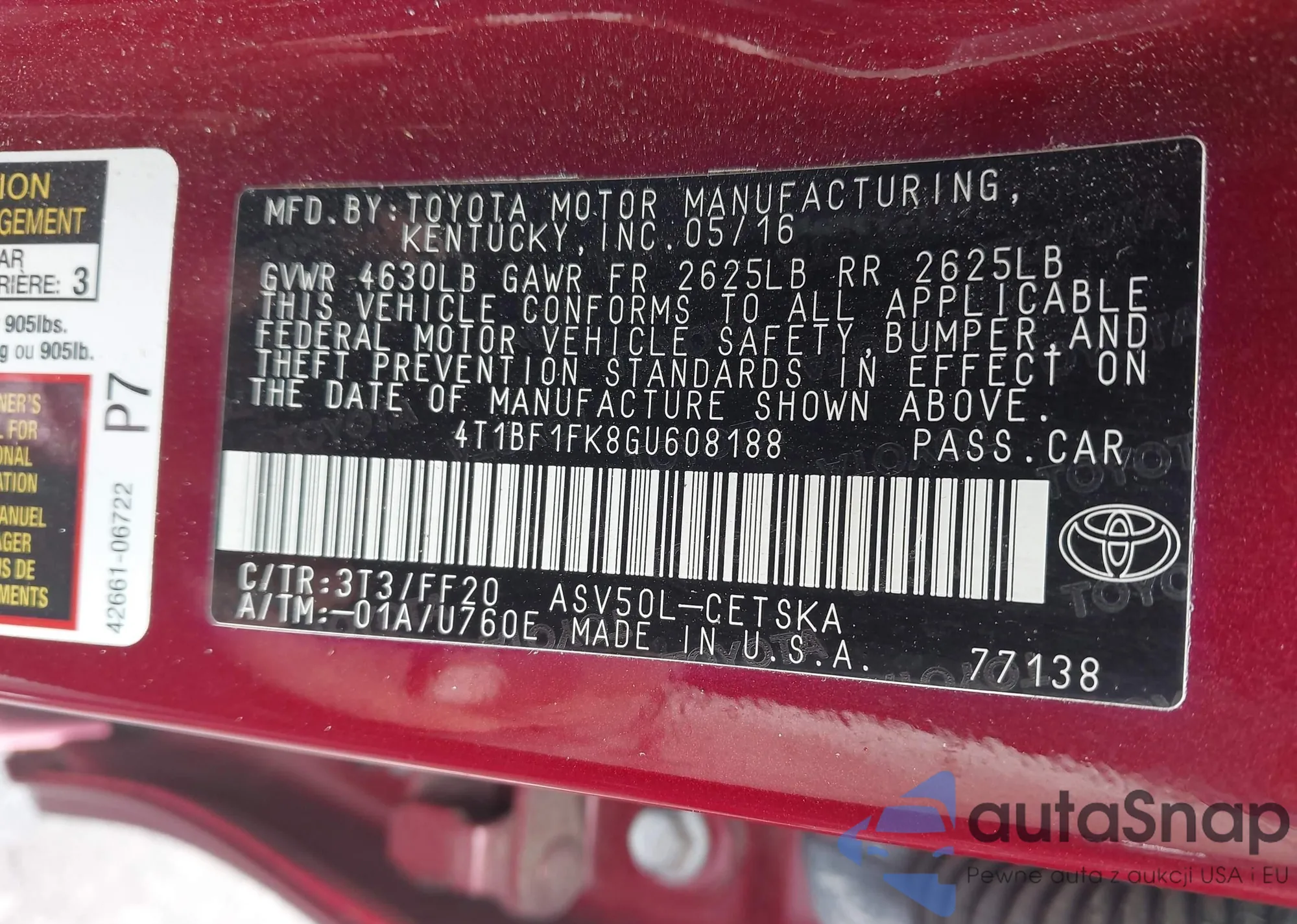 • VIN 4T1BF1FK8GU608188