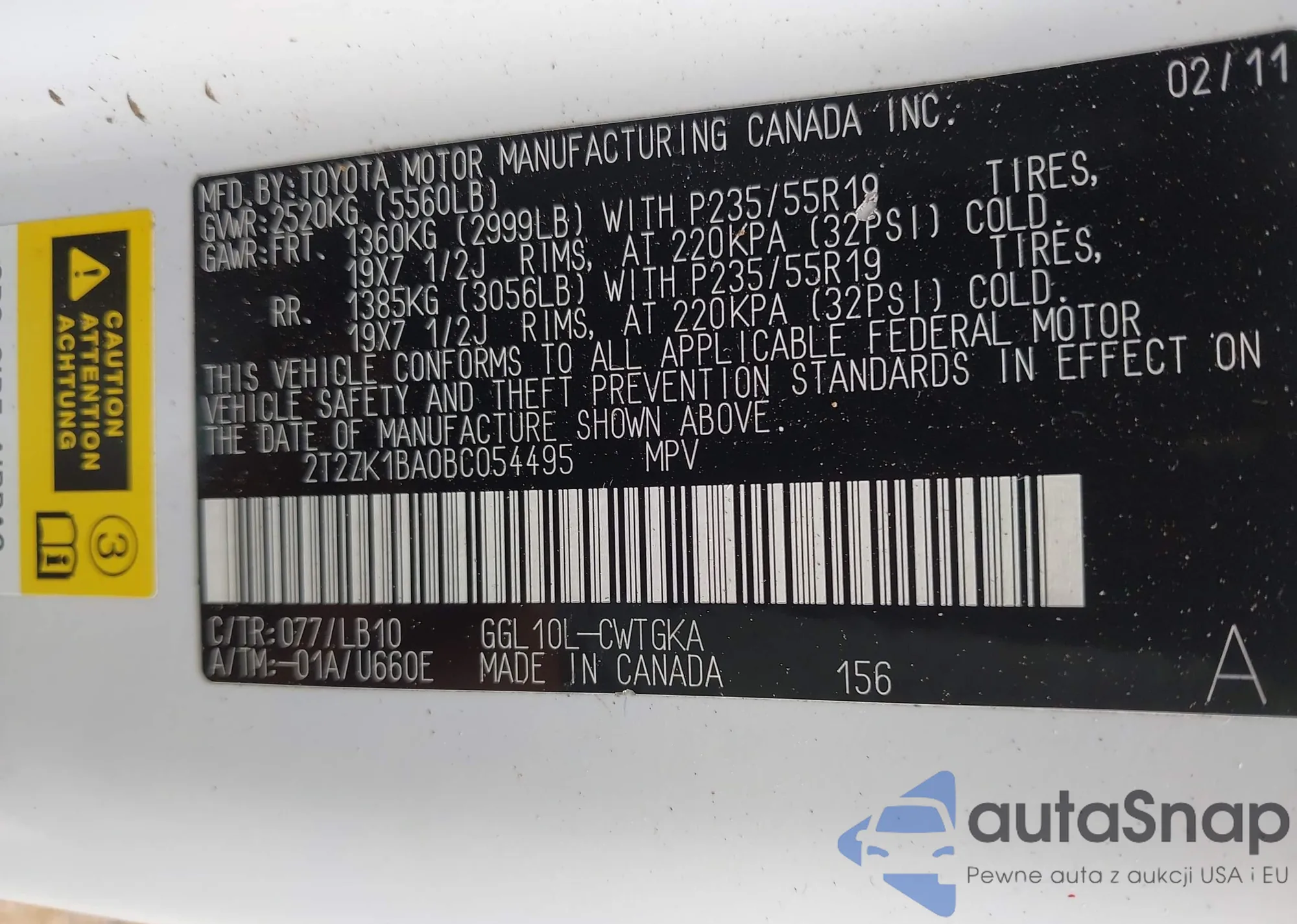 • VIN 2T2ZK1BA0BC054495