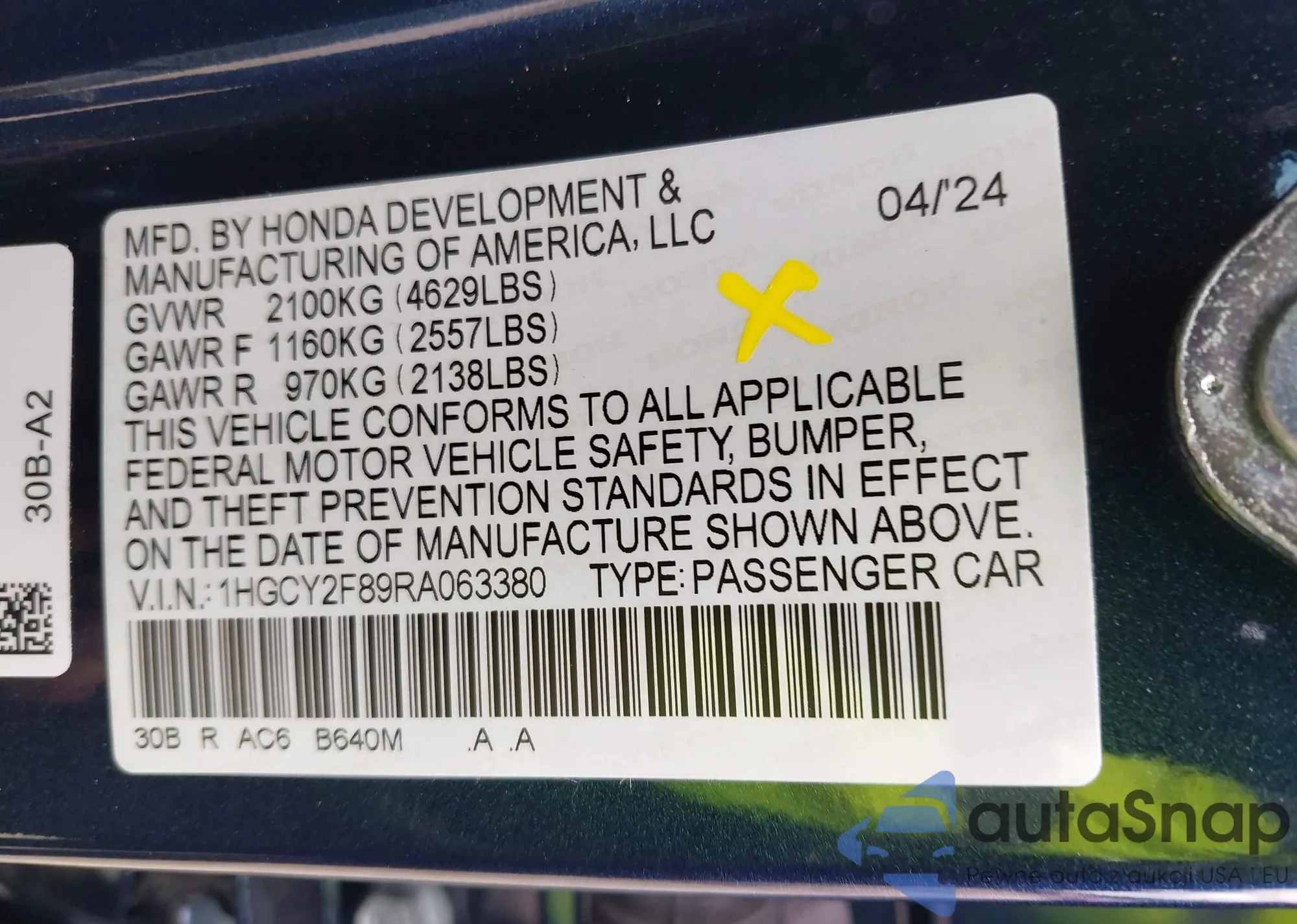 • VIN 1HGCY2F89RA063380