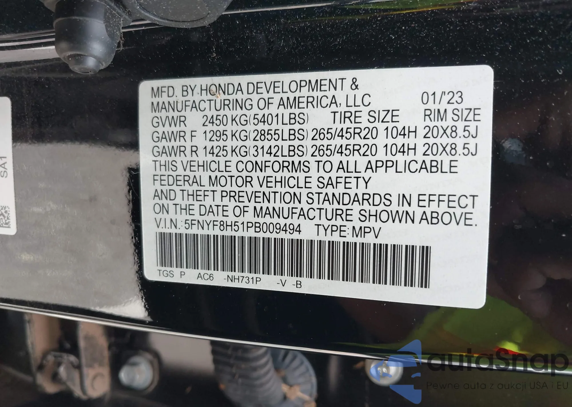 LOT: 42751895 VIN: 5FNYF8H51PB009494