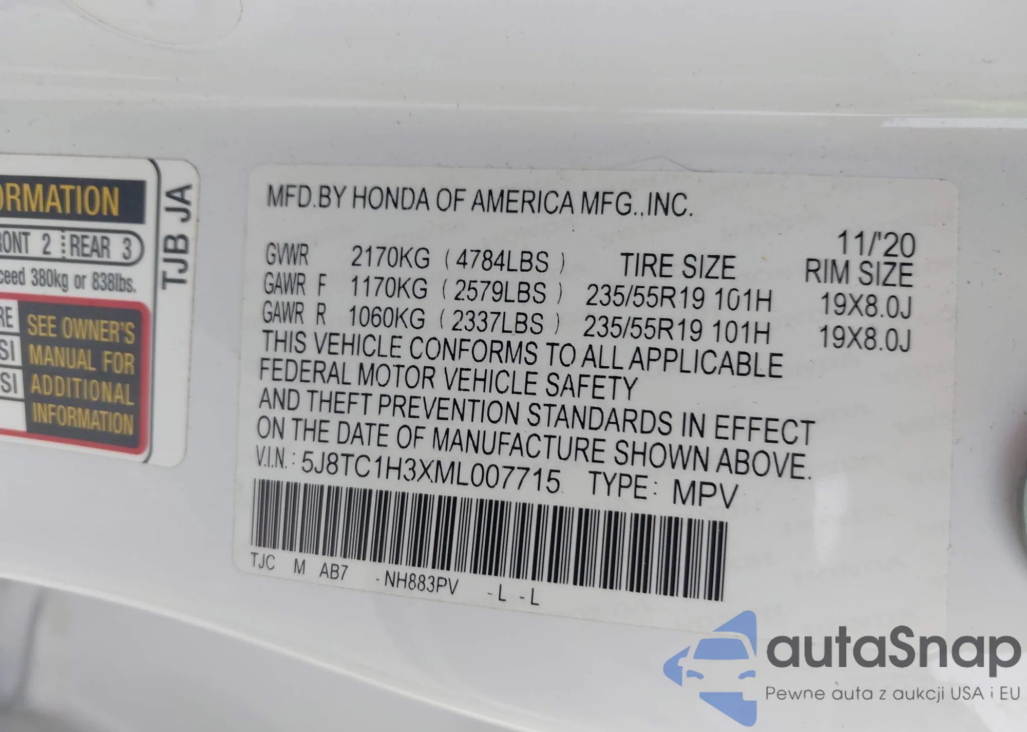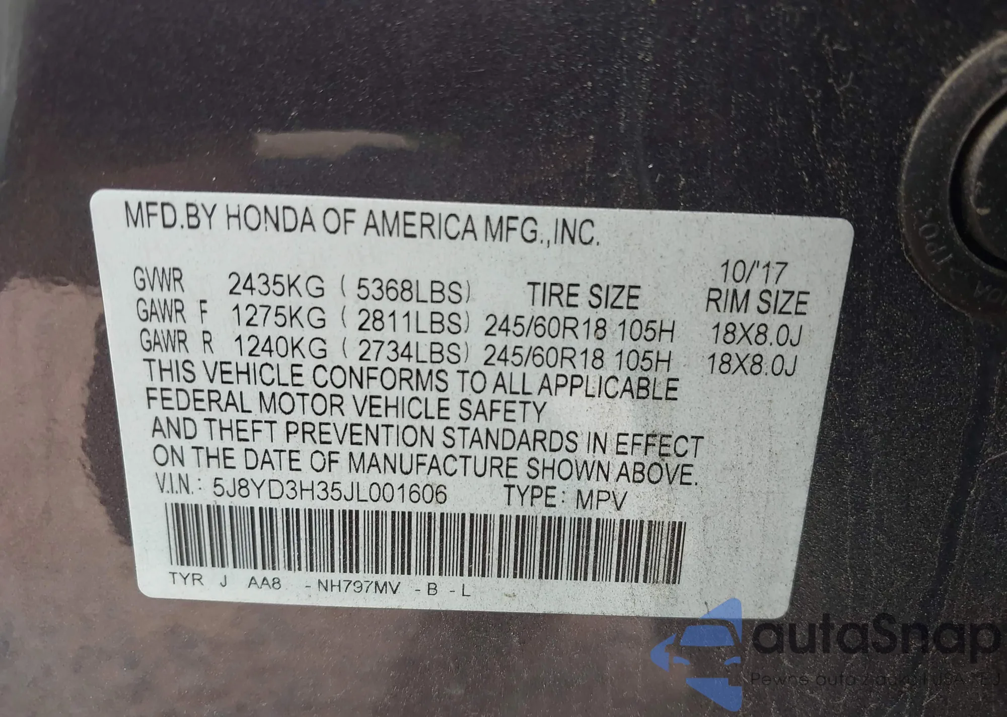 • VIN 5J8YD3H35JL001606