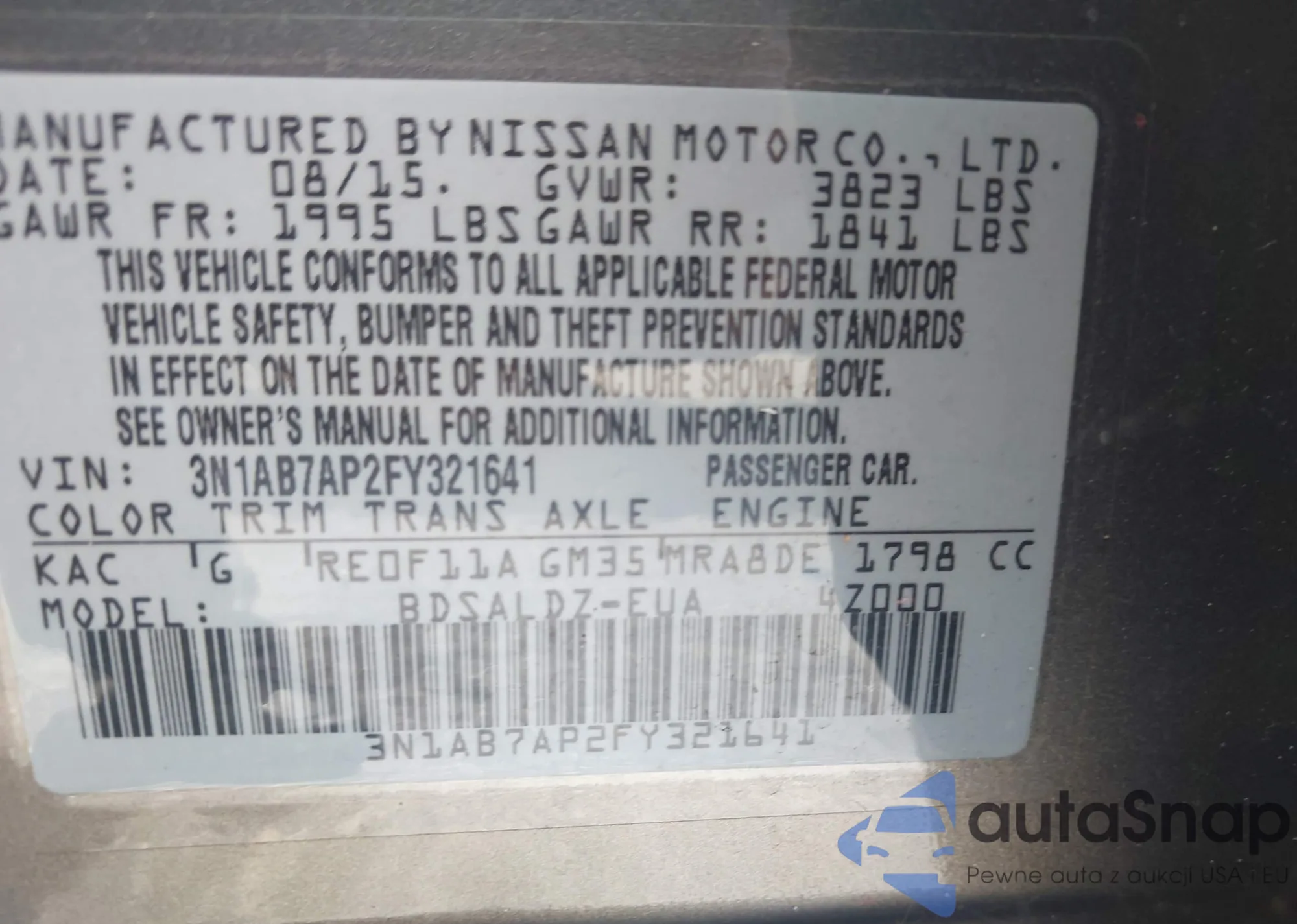 LOT: 42835770 VIN: 3N1AB7AP2FY321641
