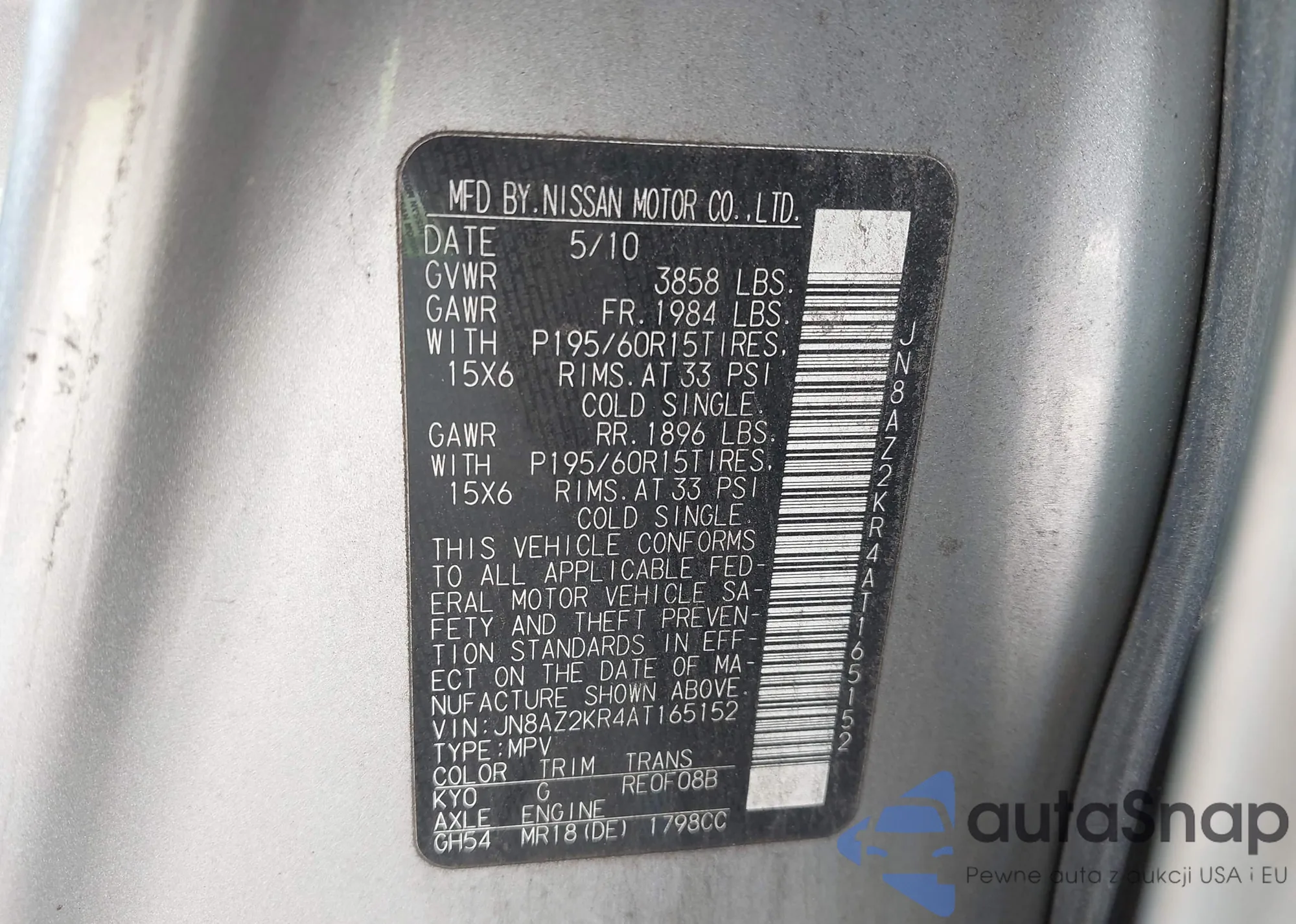 • VIN JN8AZ2KR4AT165152
