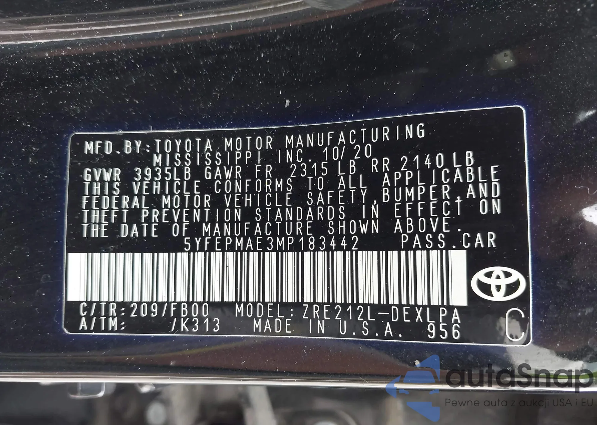 LOT: 42437982 VIN: 5YFEPMAE3MP183442